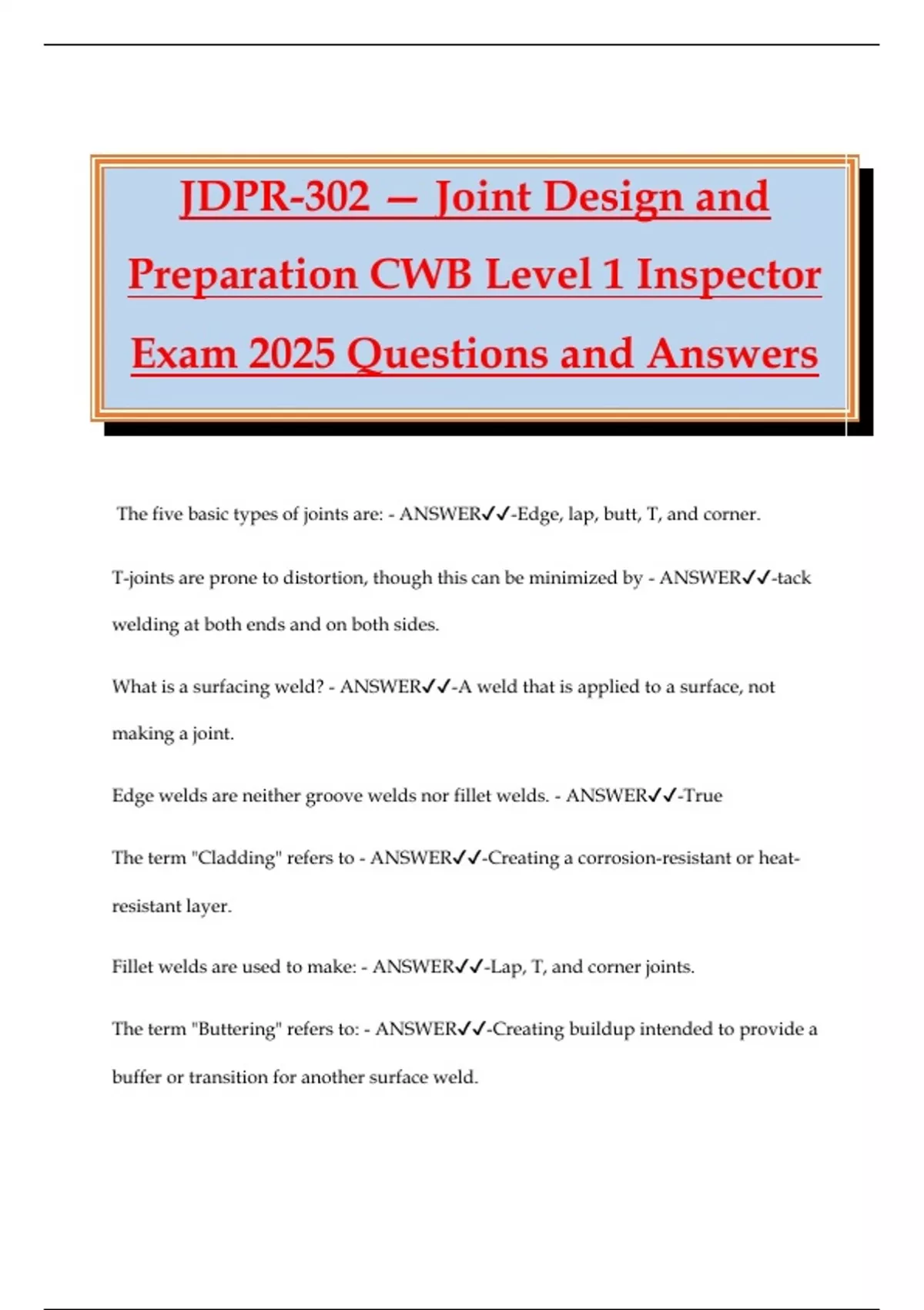JDPR-302 — Joint Design and Preparation CWB Level 1 Inspector Exam 2025 Questions and Answers