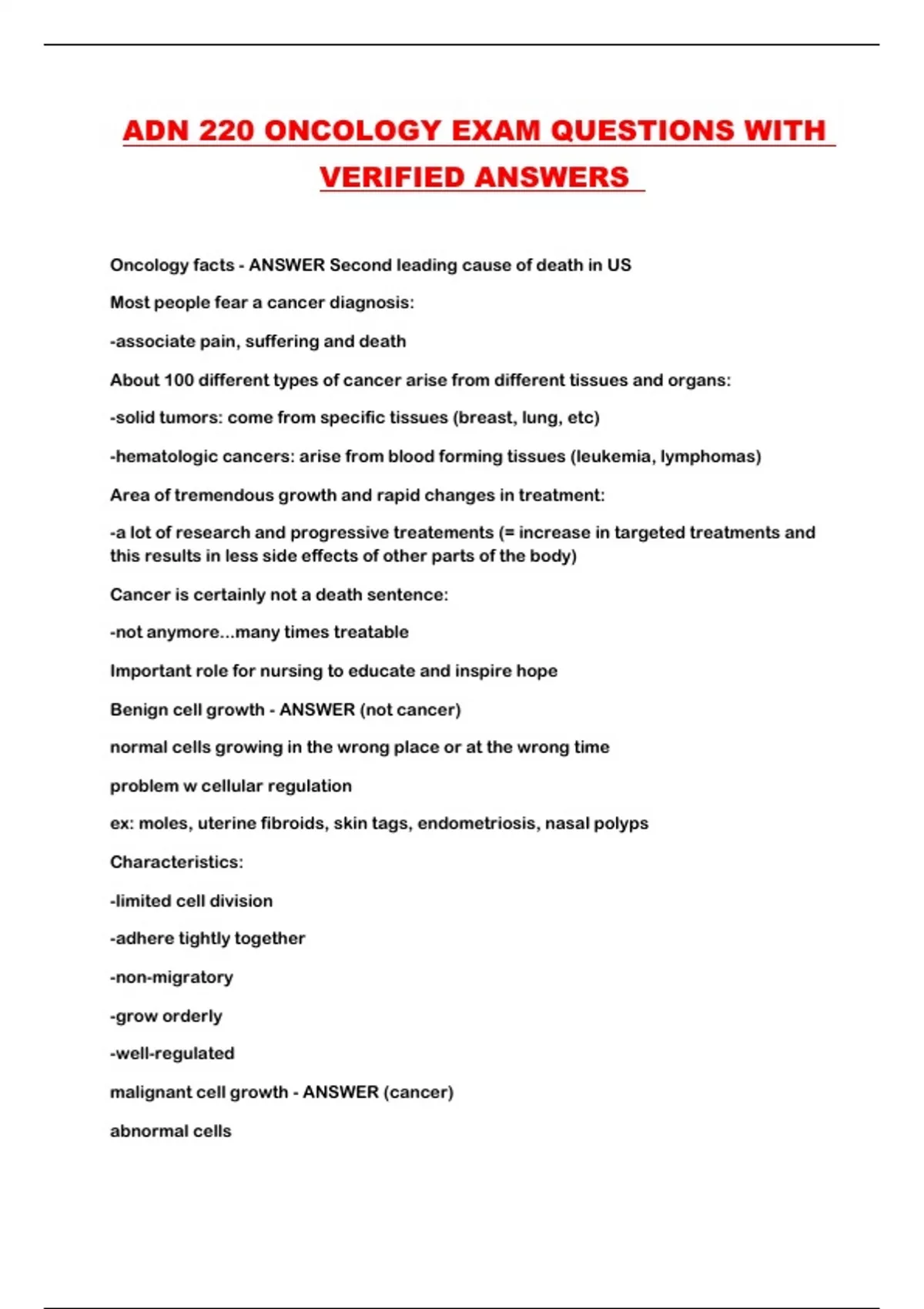 ADN 220 ONCOLOGY EXAM QUESTIONS WITH VERIFIED ANSWERS