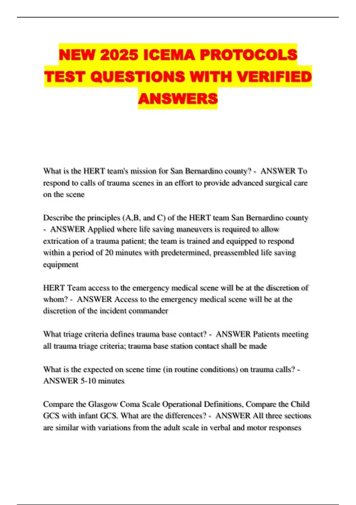 NEW 2025 ICEMA PROTOCOLS TEST QUESTIONS WITH VERIFIED ANSWERS