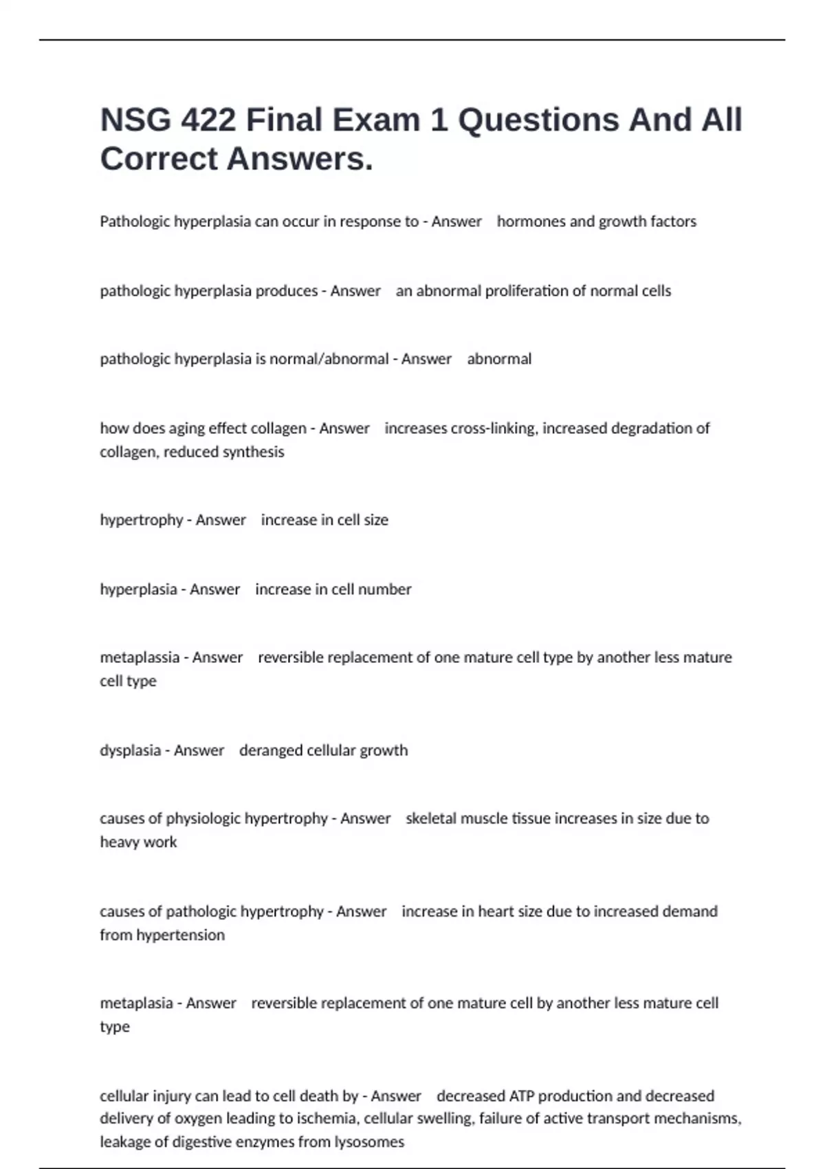 1 Exam (elaborations) NURS 422 Final Exam 5 Questions And Correct Answers. 2 Exam (elaborations) NSG 422 Exam 3 Prep Questions And All Correct Answers. 3 Exam (elaborations) Nephrology and urology NSG 422 Midterm Exam Questions And Actual Answers. 4 Exam (elaborations) Exam 1 Pathophysiology NSG 422 Final Questions Well Answered.