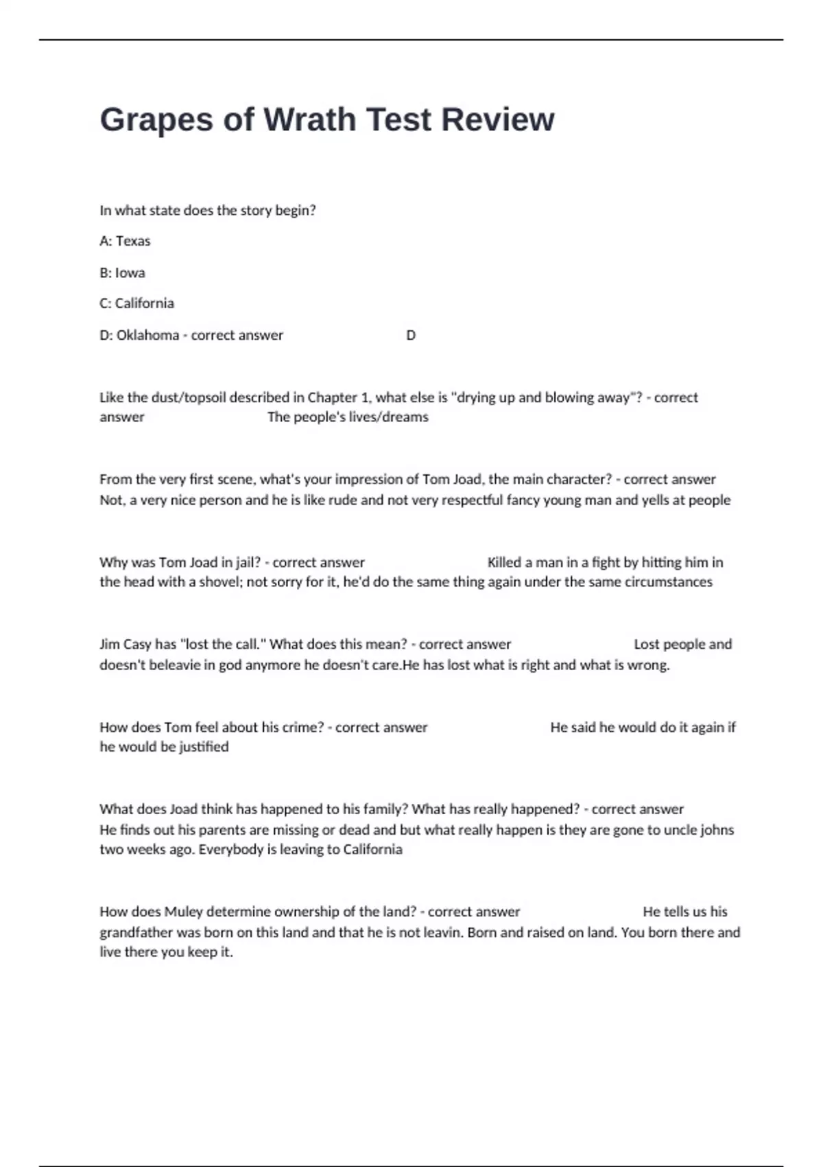 1 Exam (elaborations) GRAPES OF WRATH TEST Questions And Answers Well Defined Graded A+. 2 Exam (elaborations) Grapes of Wrath Chapters 21-24 Quiz Advanced Test Questions And Correct Detailed Answers. 3 Exam (elaborations) Grapes of Wrath Test Review Questions And Correct Verified Answers Guaranteed Success. 4 Exam (elaborations) APLAC: Steinbec