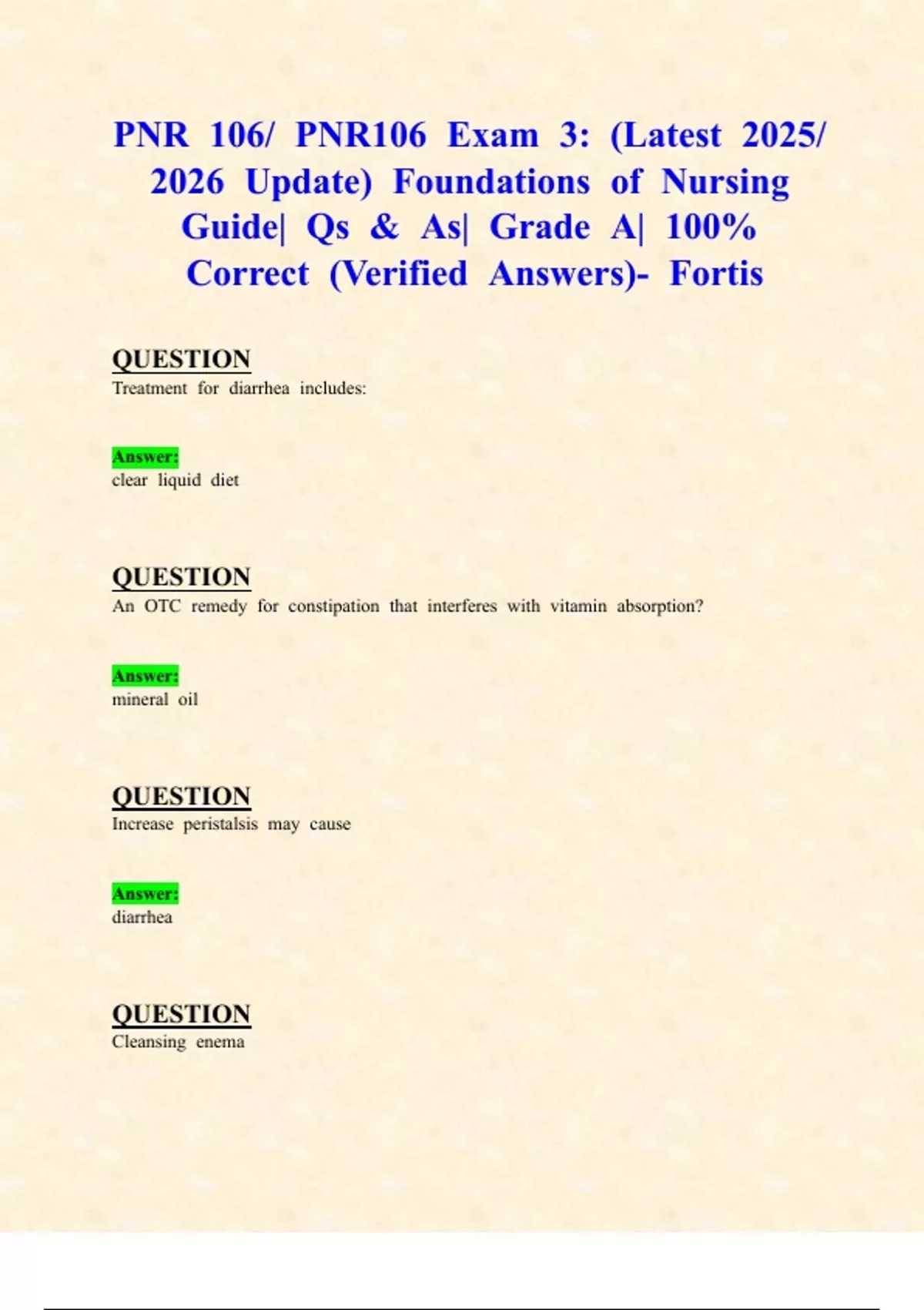 PNR 106/ PNR106 Exam 3: (Latest 2025/ 2026 Update) Foundations of Nursing Guide| Qs & As| Grade A| 100% Correct (Verified Answers)- Fortis