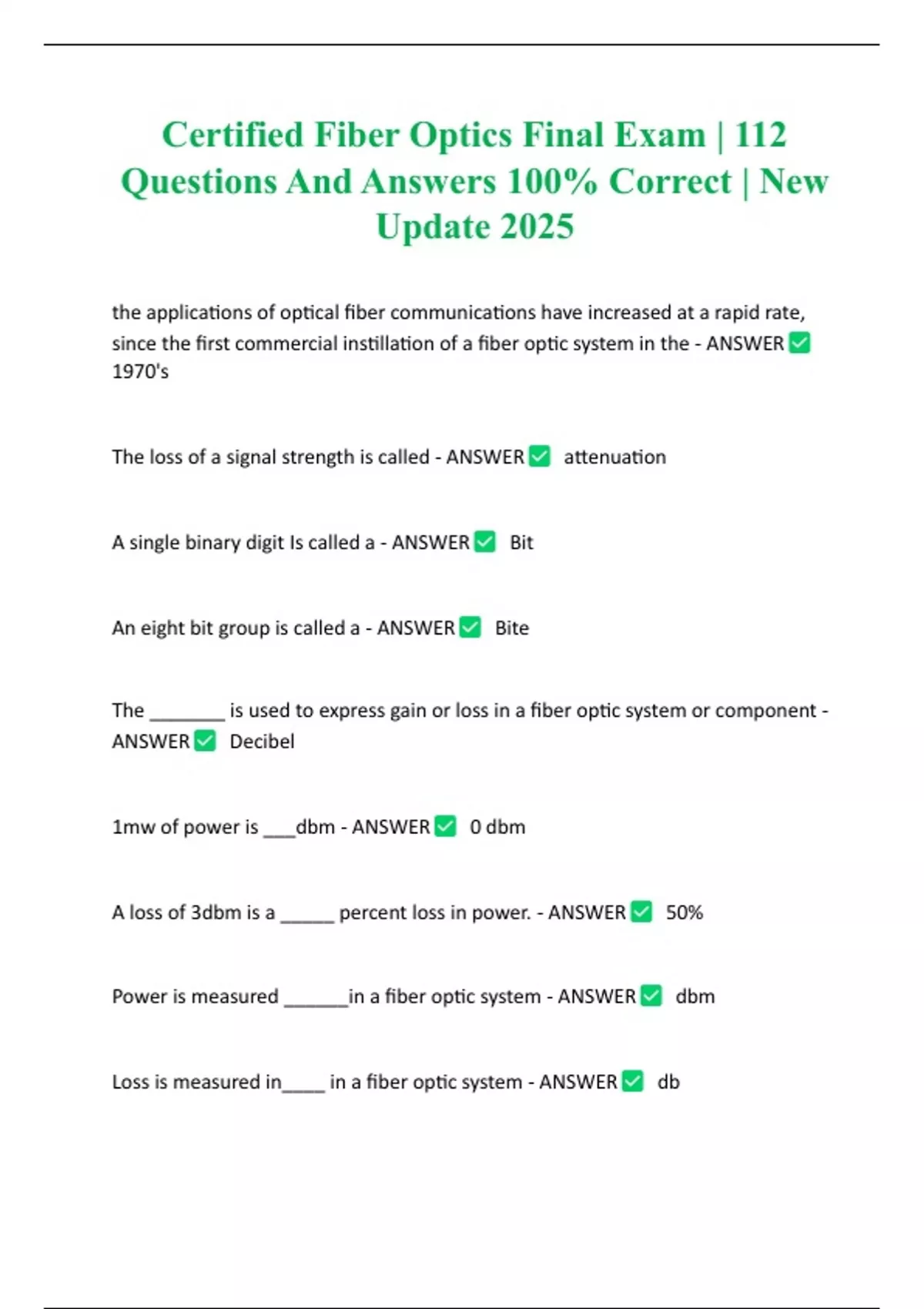 Certified Fiber Optics Final Exam | 112 Questions And Answers 100% Correct | New Update 2025