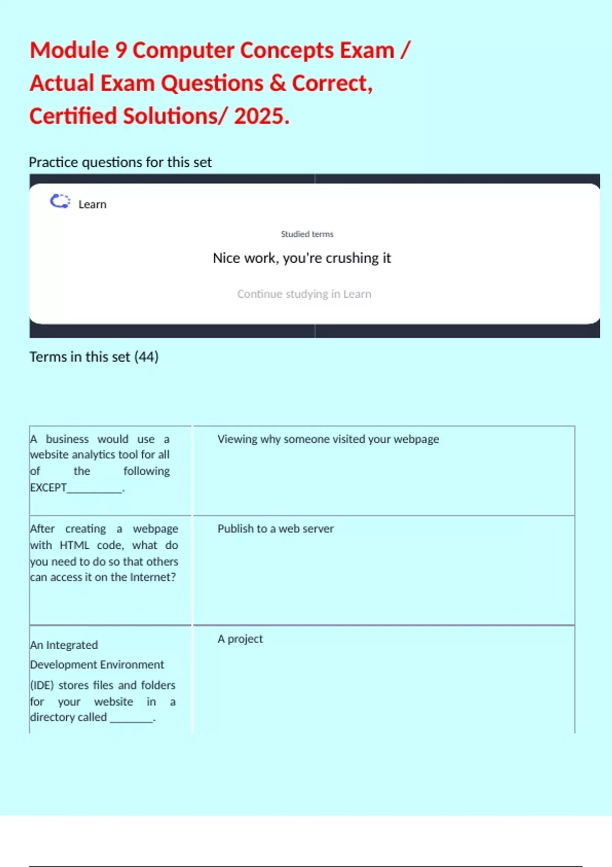 1 Exam (elaborations) Module 9 Computer Concepts Exam / Actual Exam Questions & Correct, Certified Solutions/ 2025. 2 Exam (elaborations) Computer Concepts Module 14 / Actual Exam Questions & Correct, Certified Solutions / 2025. 3 Exam (elaborations) Computer Concepts, Module 11 / Comprehensive Study Guide – Expert Strategies, Review of Key Quizz