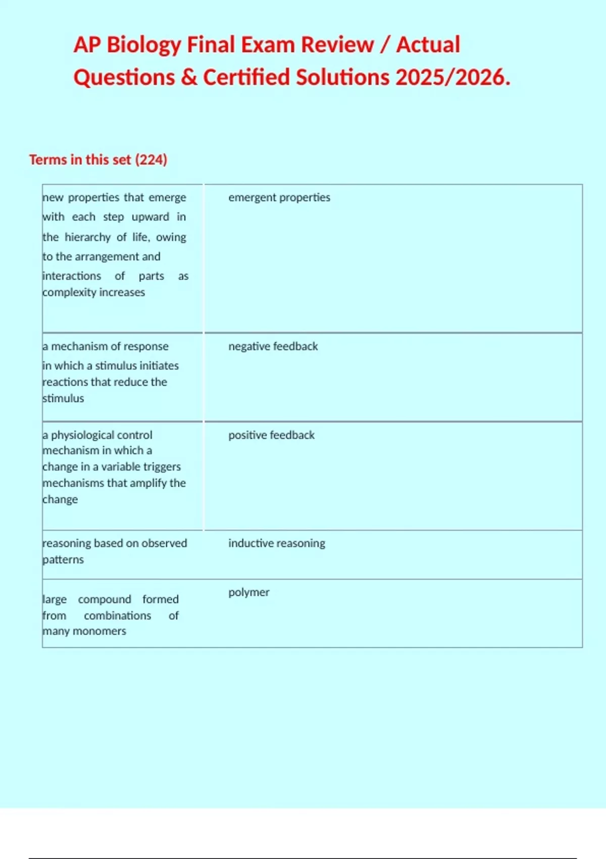 1 Exam (elaborations) AP BIOLOGY EXAM TERMS / STUDY GUIDE EXAM NEWEST ACTUAL QUESTIONS AND ANSWERS (A+ GUIDE SOLUTION) 2 Exam (elaborations) AP Biology Final Exam Review / Actual Questions & Certified Solutions 2025/2026. 3 Exam (elaborations) AP Biology Unit 1 Test (Study guide for AP junior year in high school) Expert Strategies, Review of Key
