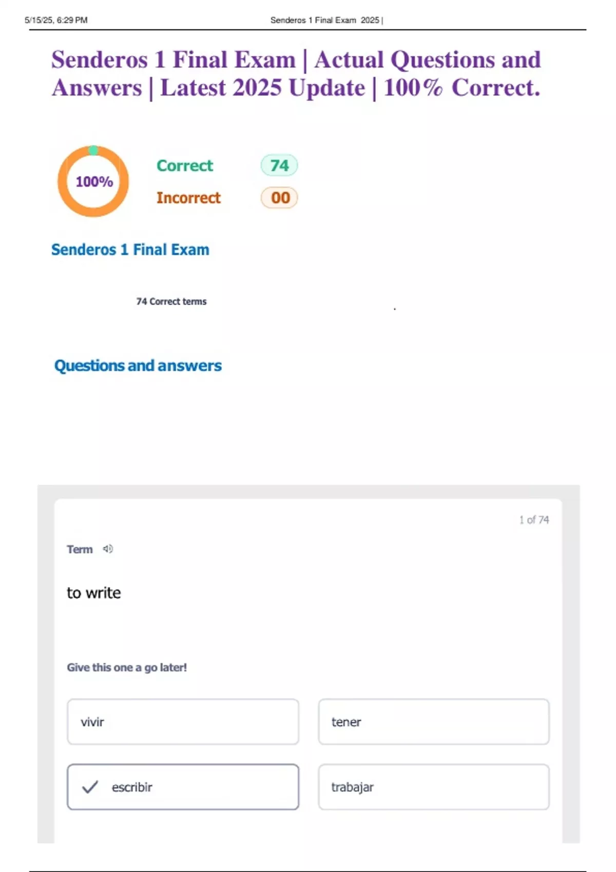 Senderos 1 Final Exam | Actual Questions and Answers | Latest 2025 Update | 100% Correct. Senderos 2 Final Exam | Actual Questions and Answers | 2025 Latest Update | 100% Correct. Senderos 3 ( El Bienestar) Final Exam | Questions and Answers | 2025 Update | 100% Correct