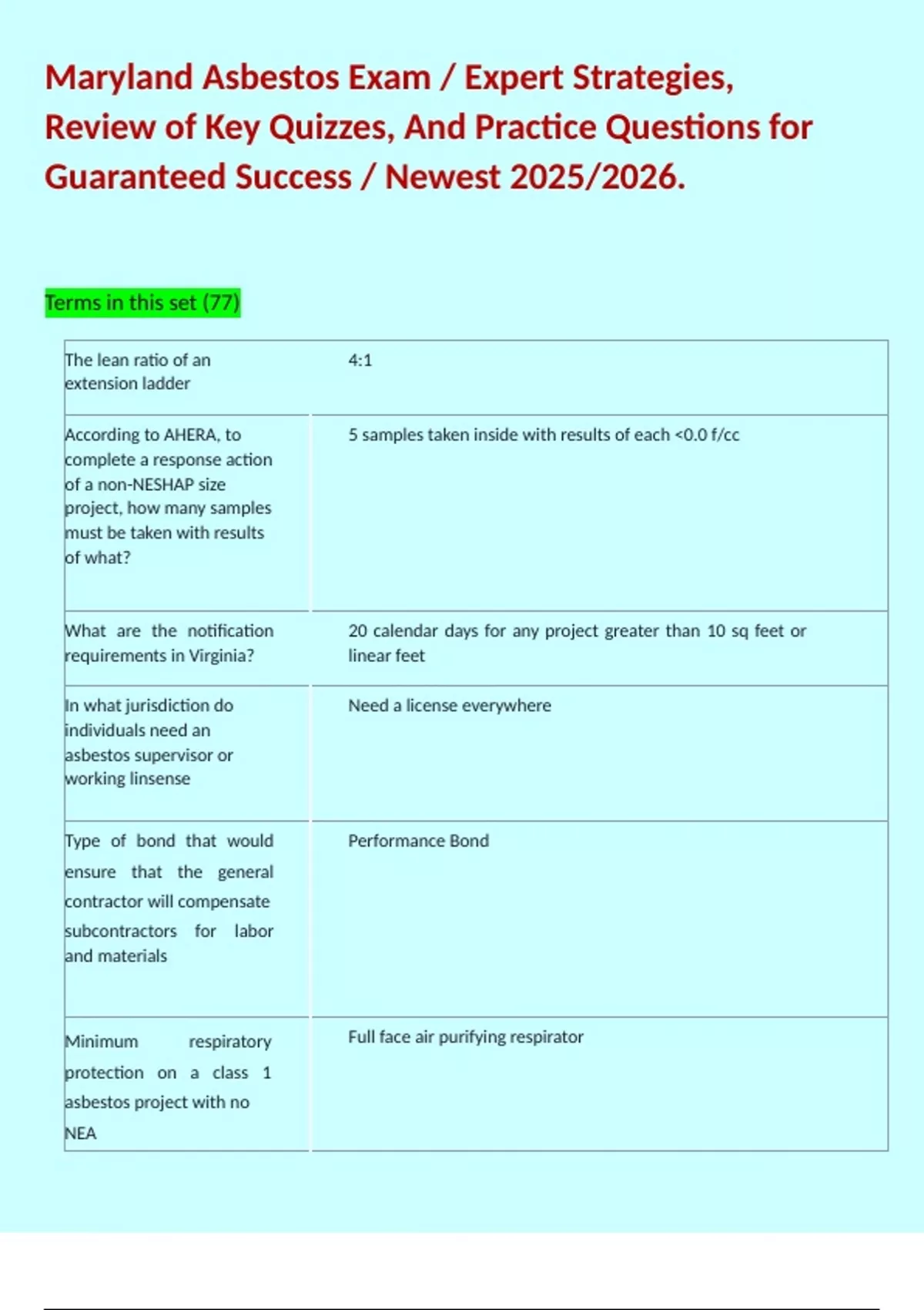 1 Exam (elaborations) Asbestos Contractor/Supervisor Examination / Study Guide Questions & Answers . 2 Exam (elaborations) Maryland Asbestos Exam / Expert Strategies, Review of Key Quizzes, And Practice Questions for Guaranteed Success / Newest 2025/2026. 3 Exam (elaborations) Asbestos Practice Exam 2 / Expert Verified Actual Questions &