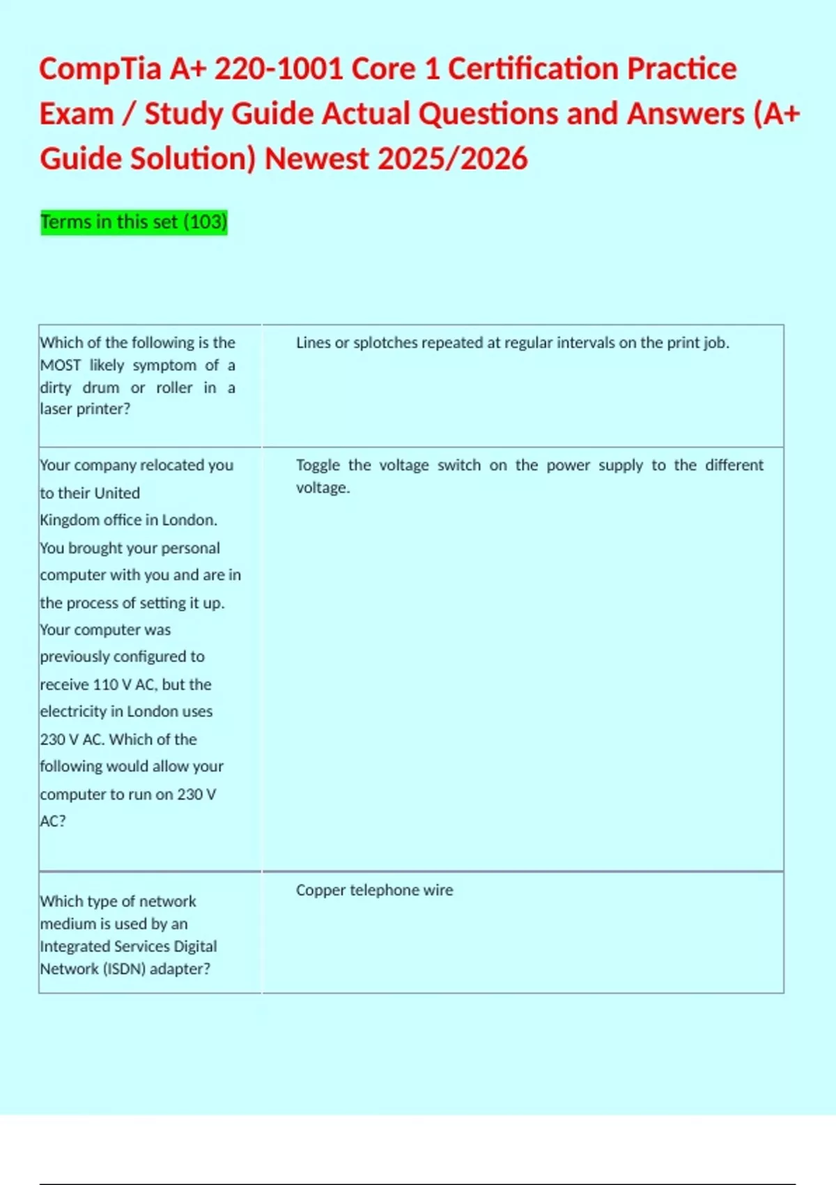 1 Exam (elaborations) CompTia A+ 220-1001 Core 1 Certification Practice Exam / Study Guide Actual Questions and Answers (A+ Guide Solution) Newest 2025/2026 2 Exam (elaborations) CompTIA A+ Certification (220-1102) Comprehensive Study Guide – Expert Strategies, Review of Key Quizzes, and Practice Questions for Guaranteed Success