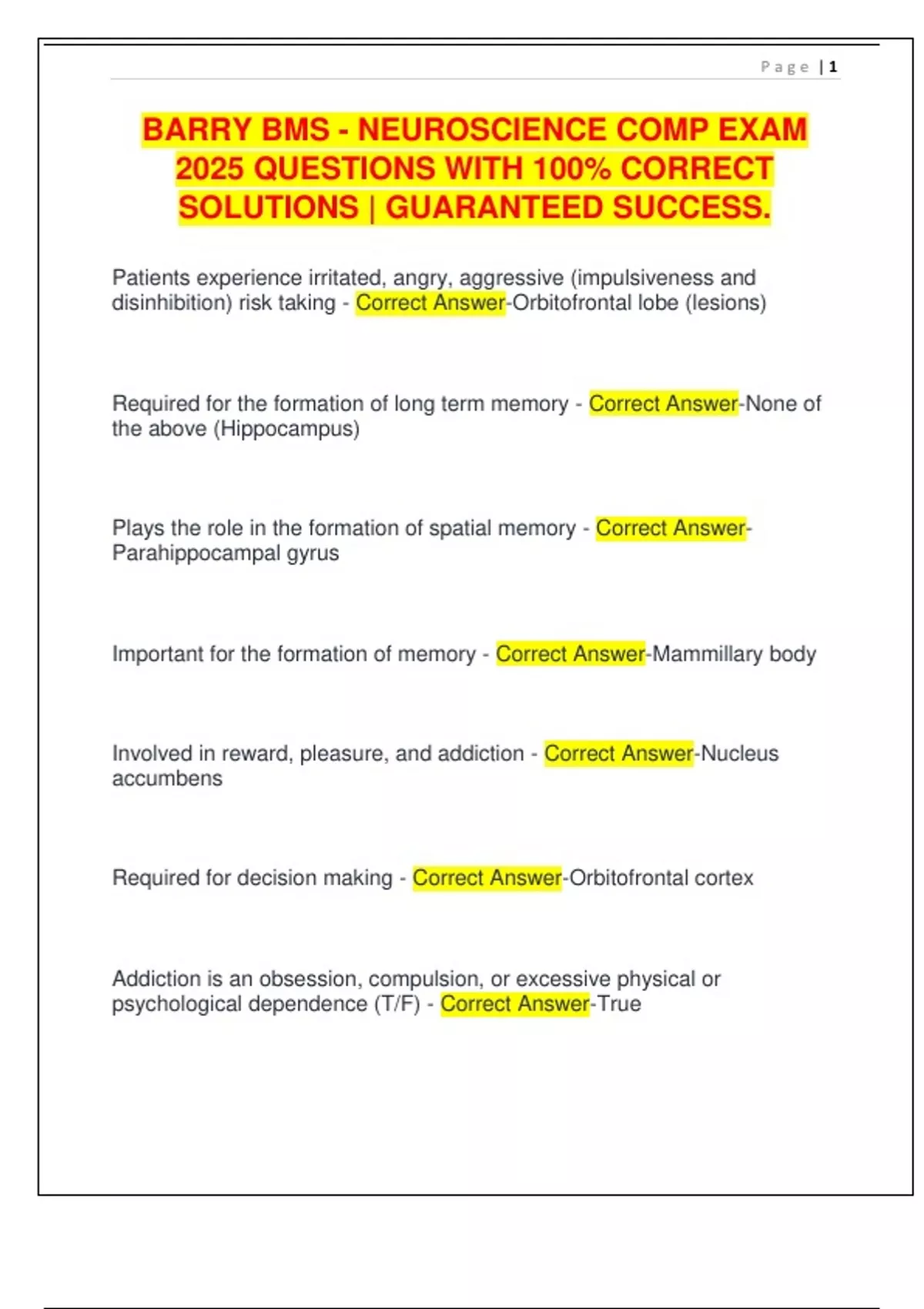 BARRY BMS - NEUROSCIENCE COMP EXAM 2025 QUESTIONS WITH 100% CORRECT SOLUTIONS | GUARANTEED SUCCESS.