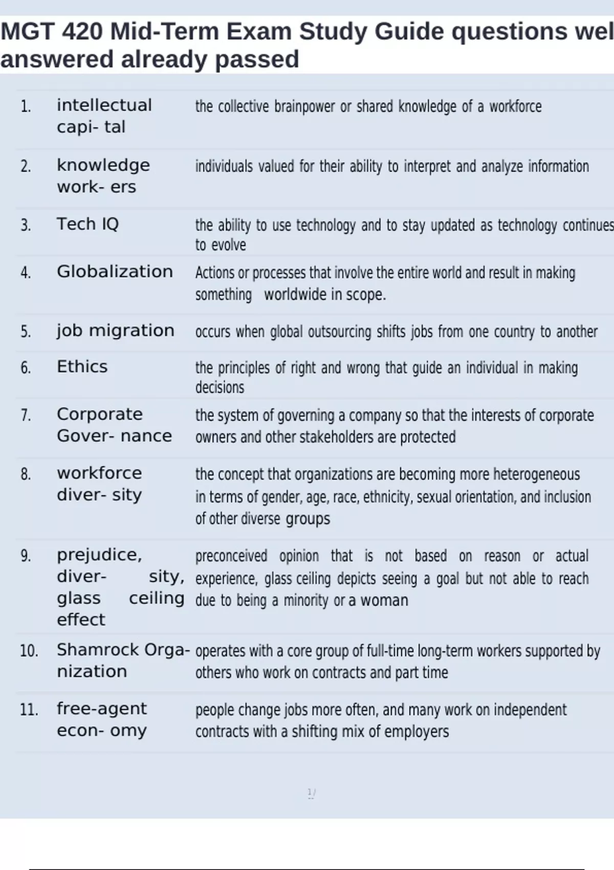 MGT 420 Mid-Term Exam Study Guide questions well answered already passed
