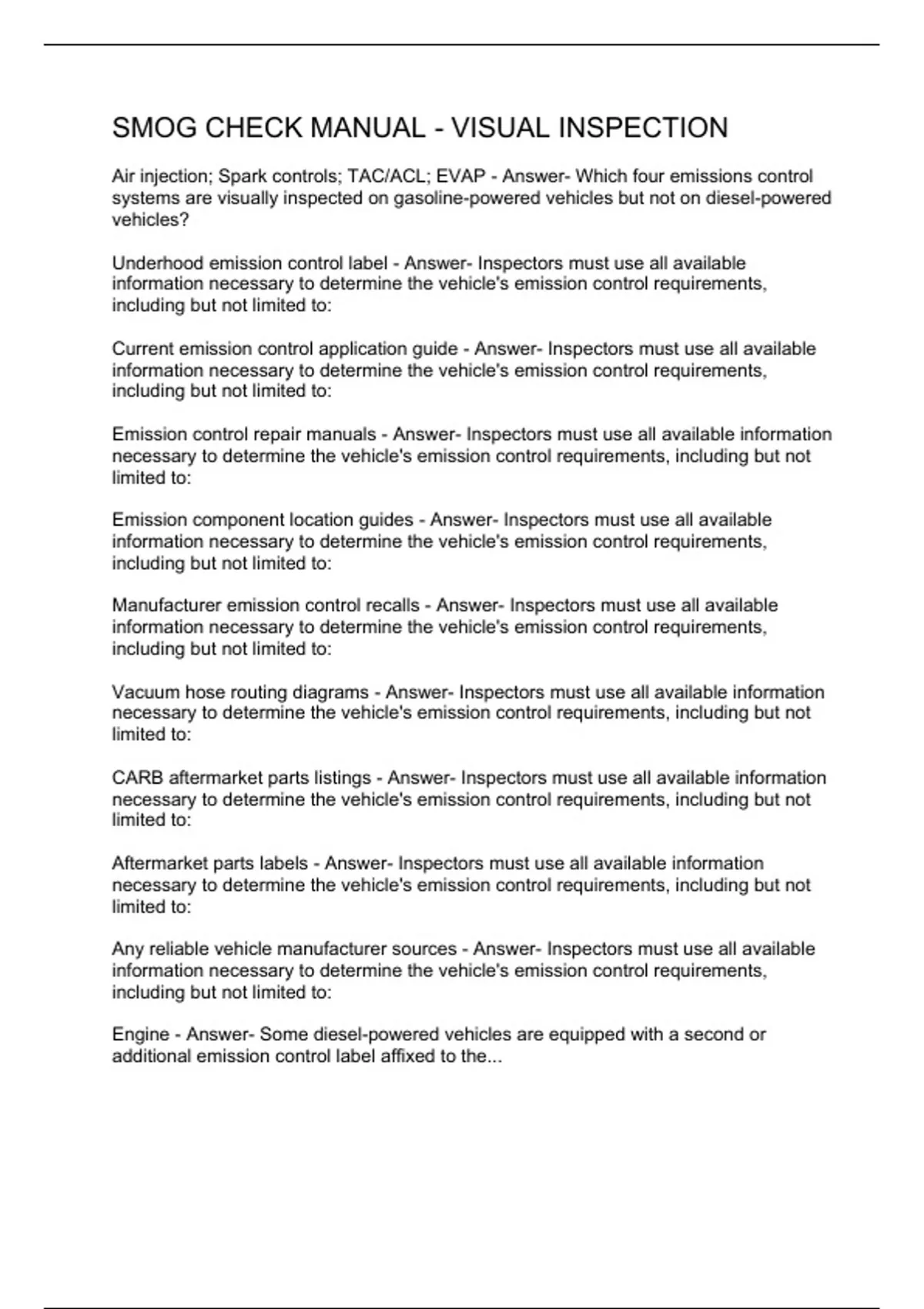 CA SMOG CHECK INSPECTOR TRAINING FINAL REVIEW 2 Exam (elaborations) BAR SMOG CHECK GASOLINE VISIBLE SMOKE TEST TRAINING 3 Exam (elaborations) AUTO200 LEVEL 1 BAR SMOG INSPECTOR COURSE 4 Exam (elaborations) SMOG CHECK INSPECTOR EXAM CA 5 Exam (elaborations) Smog and Air Pollution Q&A 2025 6 Exam (elaborations) CA SMOG CHECK INSPECTOR TRAINING R