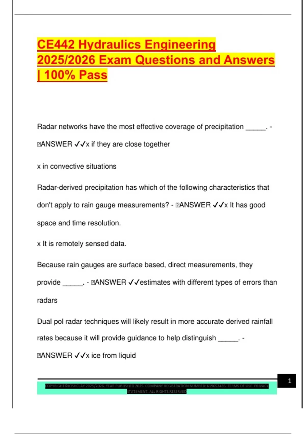 CE442 Hydraulics Engineering 2025/2026 Exam Questions and Answers | 100% Pass