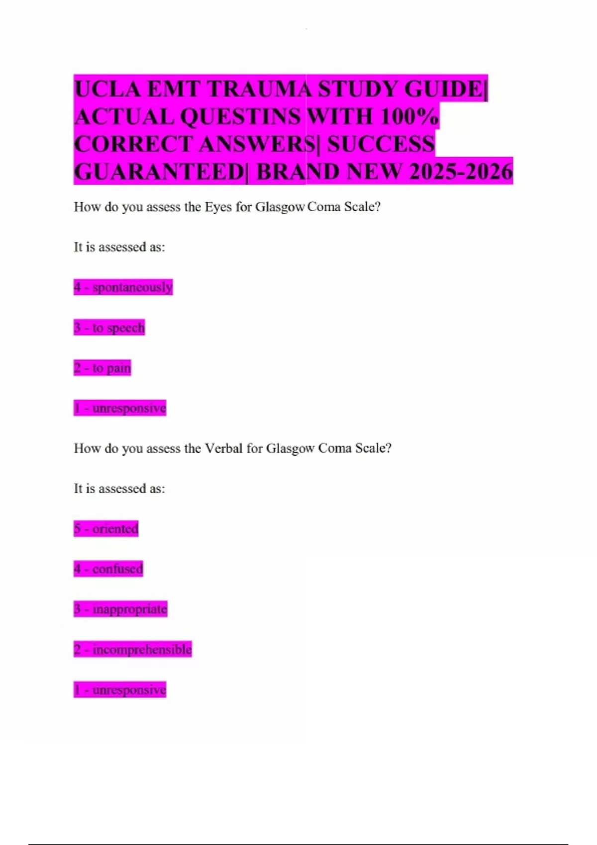 UCLA EMT TRAUMA STUDY GUIDE| ACTUAL QUESTINS WITH 100% CORRECT ANSWERS| SUCCESS GUARANTEED| BRAND NEW