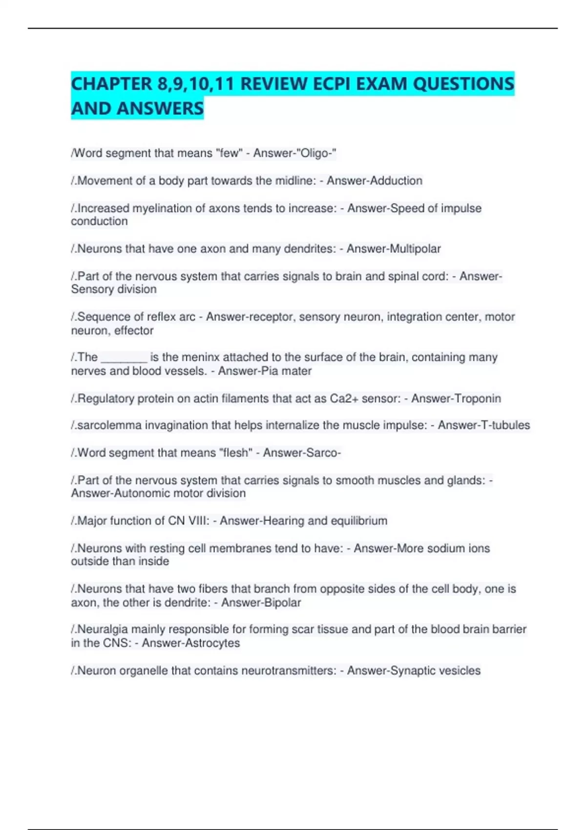 1 Exam (elaborations) CHAPTER 8,9,10,11 REVIEW ECPI EXAM QUESTIONS AND ANSWERS 2 Exam (elaborations) CHAPTER 8,9,10,11 REVIEW ECPI EXAM 3 Exam (elaborations) ECPI A&P 1 Final Exam Questions with 100% Correct Answers | Verified | Latest Update 4 Exam (elaborations) ECPI Essentials of Nursing Practice Chapter 1 Exam 1 Questions with Correct Answer