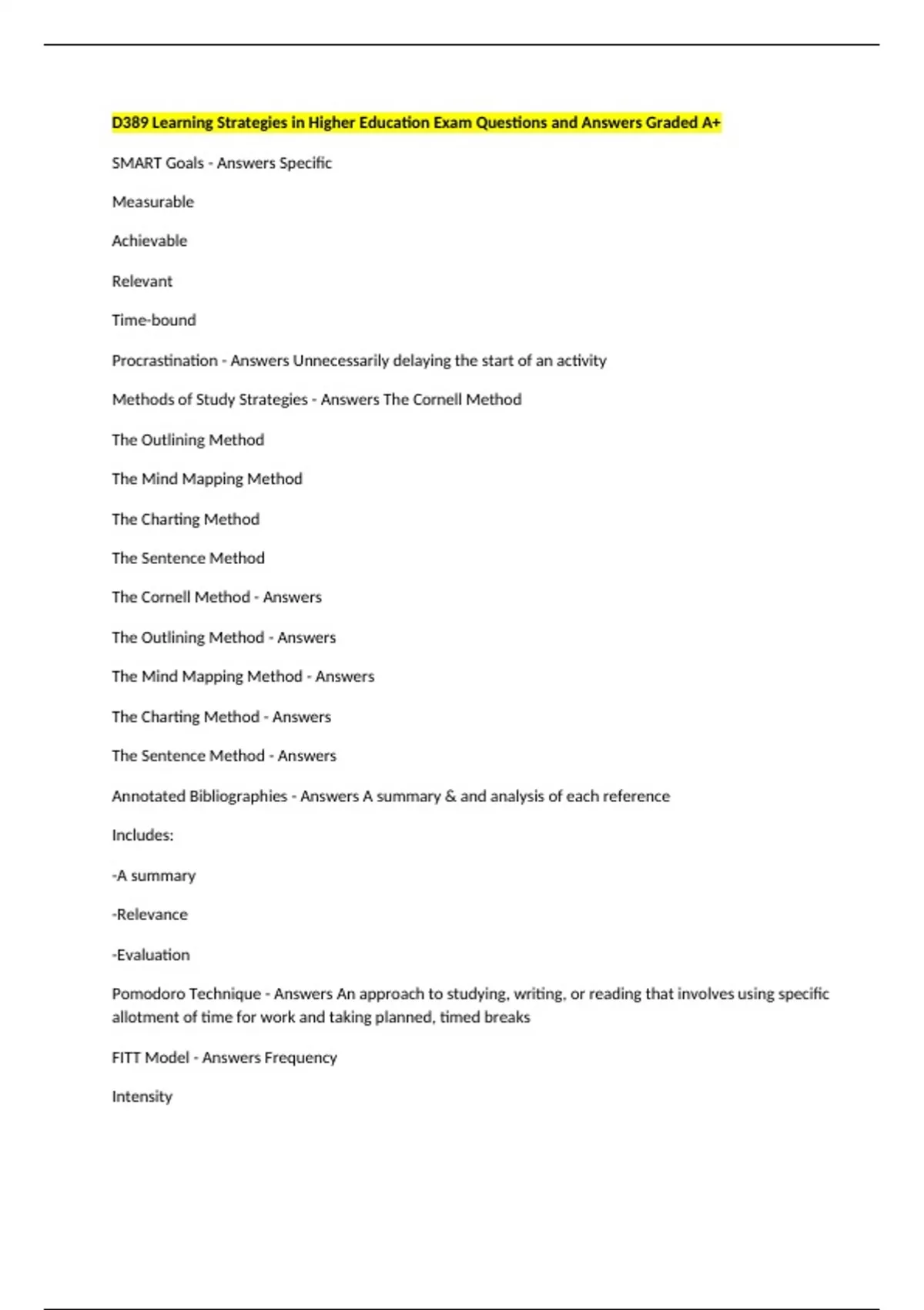 D389 Learning Strategies in Higher Education Exam Questions and Answers Graded A+