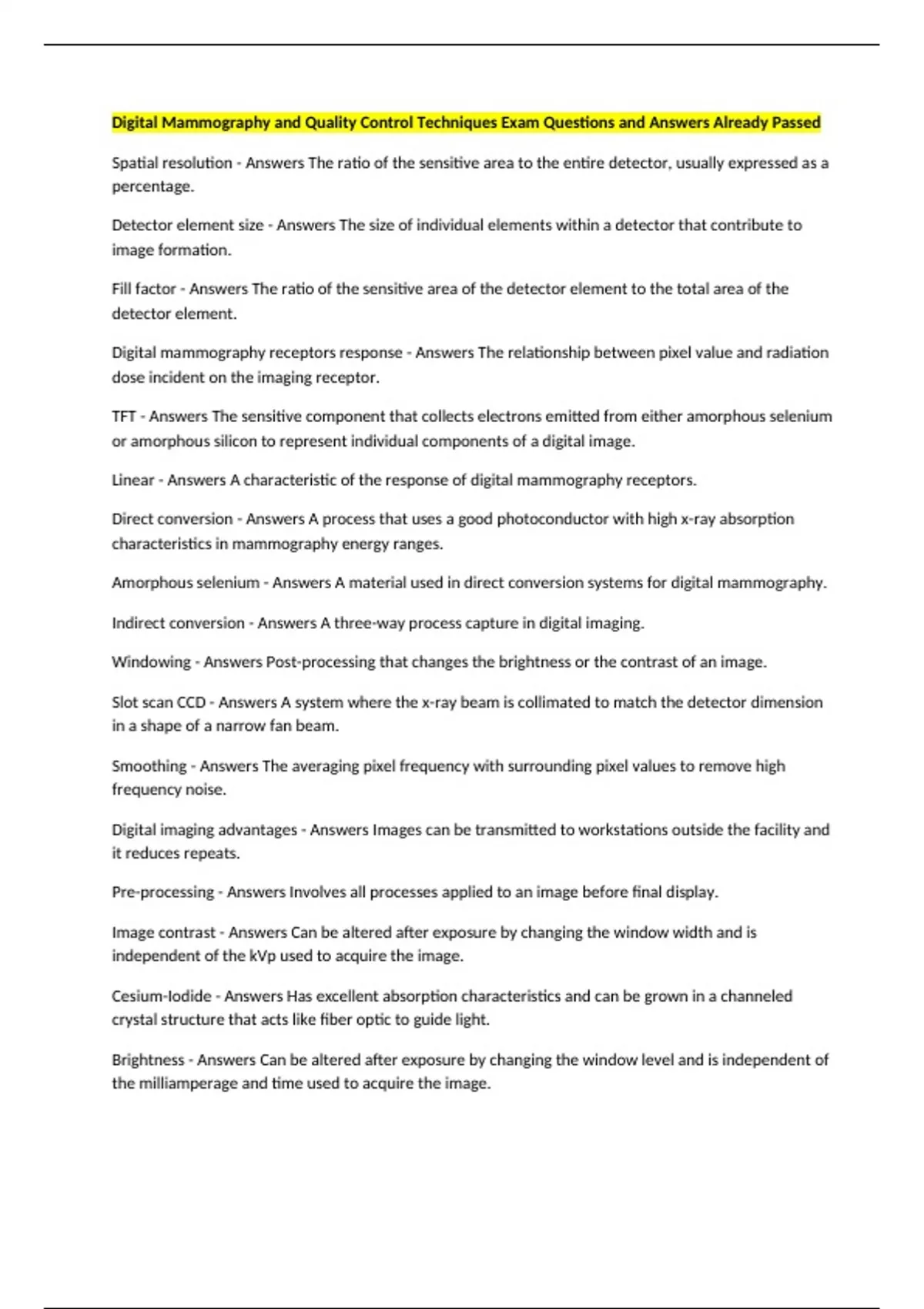 Digital Mammography and Quality Control Techniques Exam Questions and Answers Already Passed