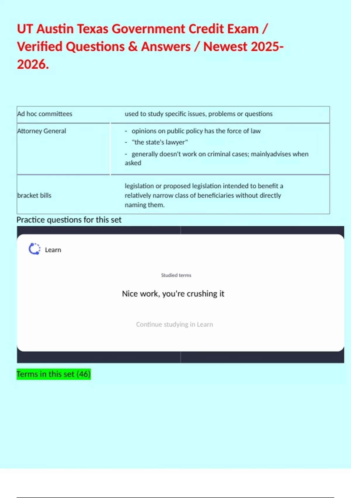 1 Exam (elaborations) UT Texas Government Only Credit-Exam Questions & Answers (Verified, Detailed Answers) A Grade. 2 Exam (elaborations) UT Austin Texas Government Credit Exam / Expert Verified Actual Questions & Answers for Guaranteed Pass | Newest Update, . 3 Exam (elaborations) UT Austin Texas Government Credit Exam / Verified Quest