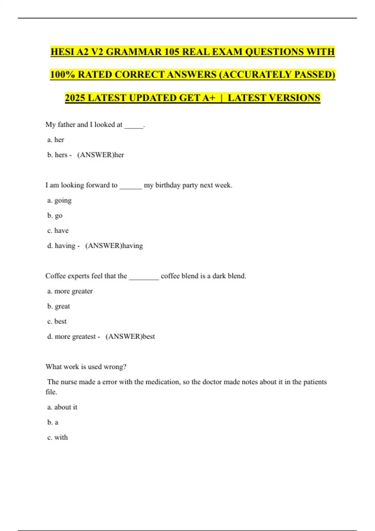 PACKAGE DEAL FOR HESI A2 V1 & V2 GRAMMAR REAL EXAMS QUESTIONS WITH 100% RATED CORRECT ANSWERS (ACCURATELY PASSED) 2025 LATEST UPDATED GET A _| LATEST VERSIONS