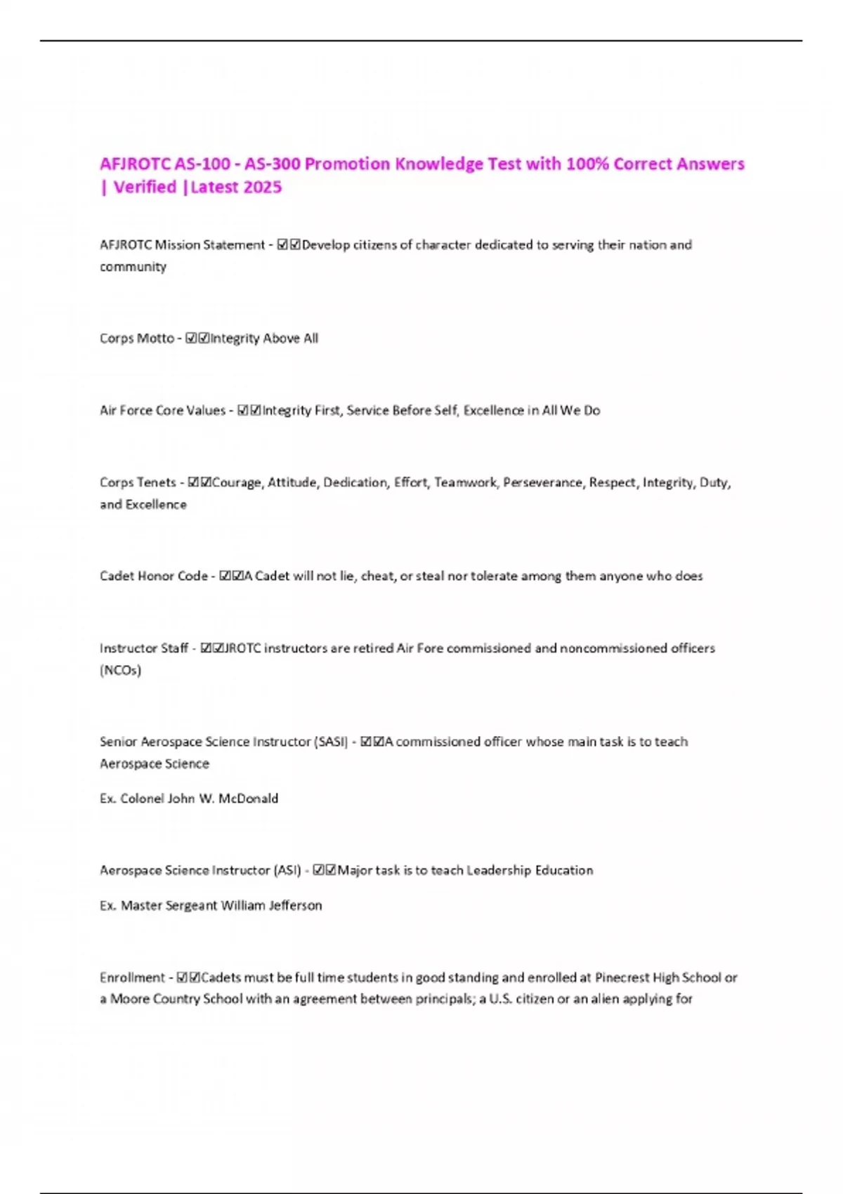 AFJROTC AS-100 - AS-300 Promotion Knowledge Test with 100% Correct Answers | Verified |Latest 2025