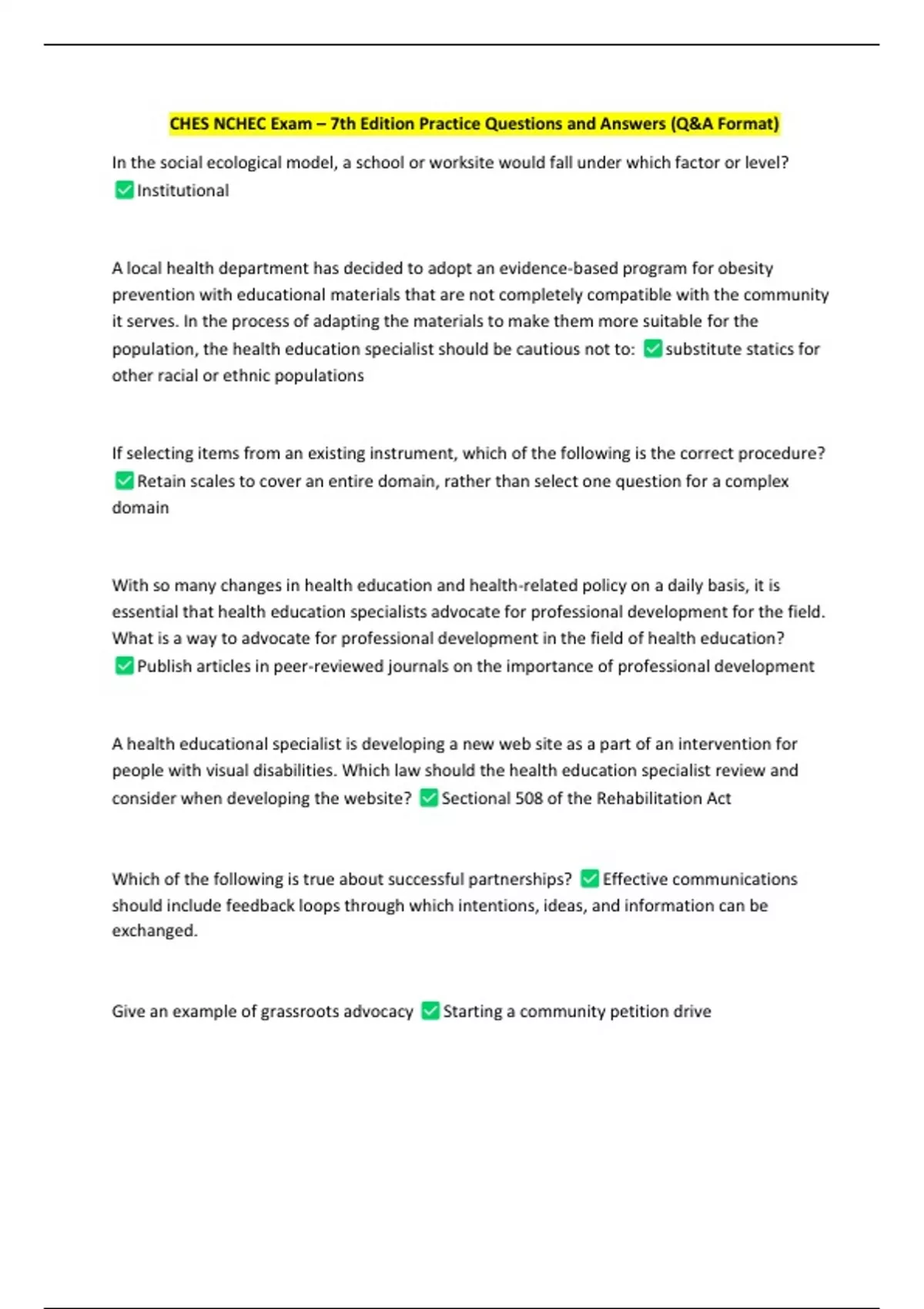 NCHEC CHES Exam – Area of Responsibility I: Assess Needs, Assets, and Capacity for Health Education – Practice Questions and Answers 3 Exam (elaborations) NCHEC CHES Exam – Practice Questions from 8th Edition Health Education Study Guide 4 Exam (elaborations) NCHEC – Area II: Plan Health Education/Promotion – Practice Questions and Answers 5 Exam (
