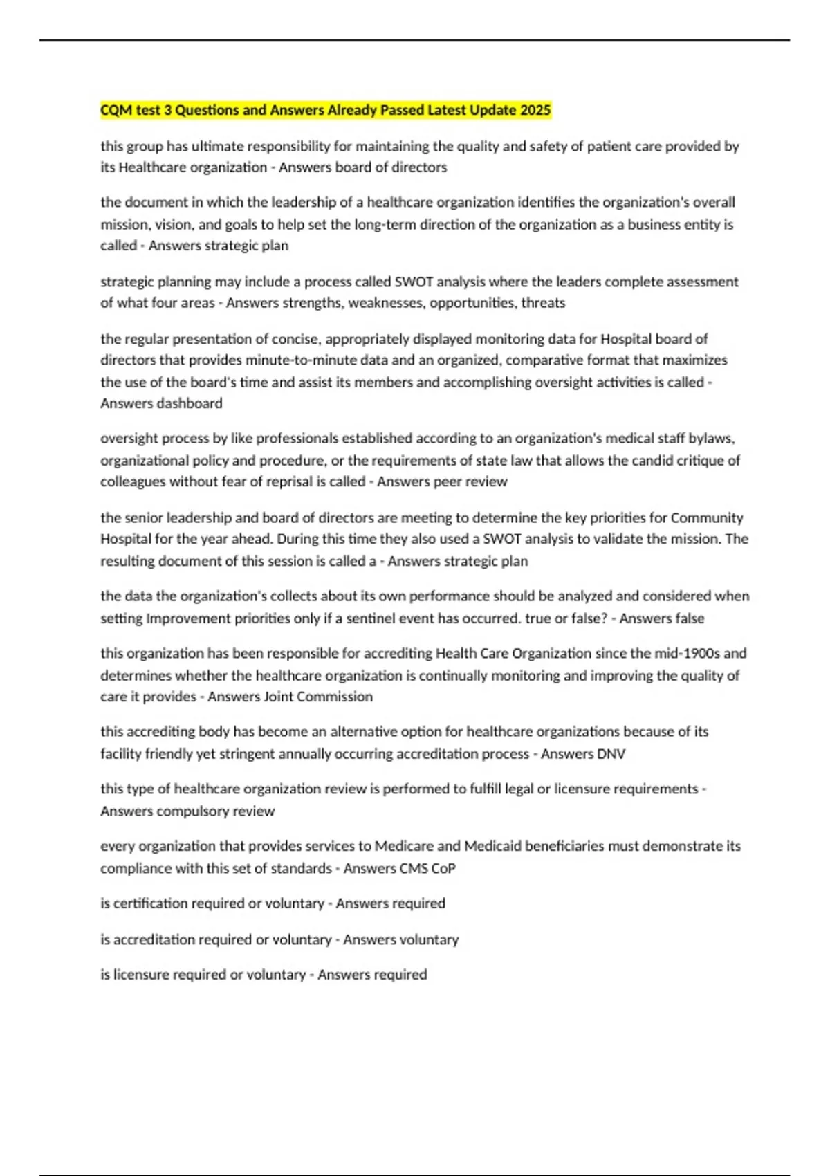 CQM Bundled Questions with Correct Answers Solved Correctly