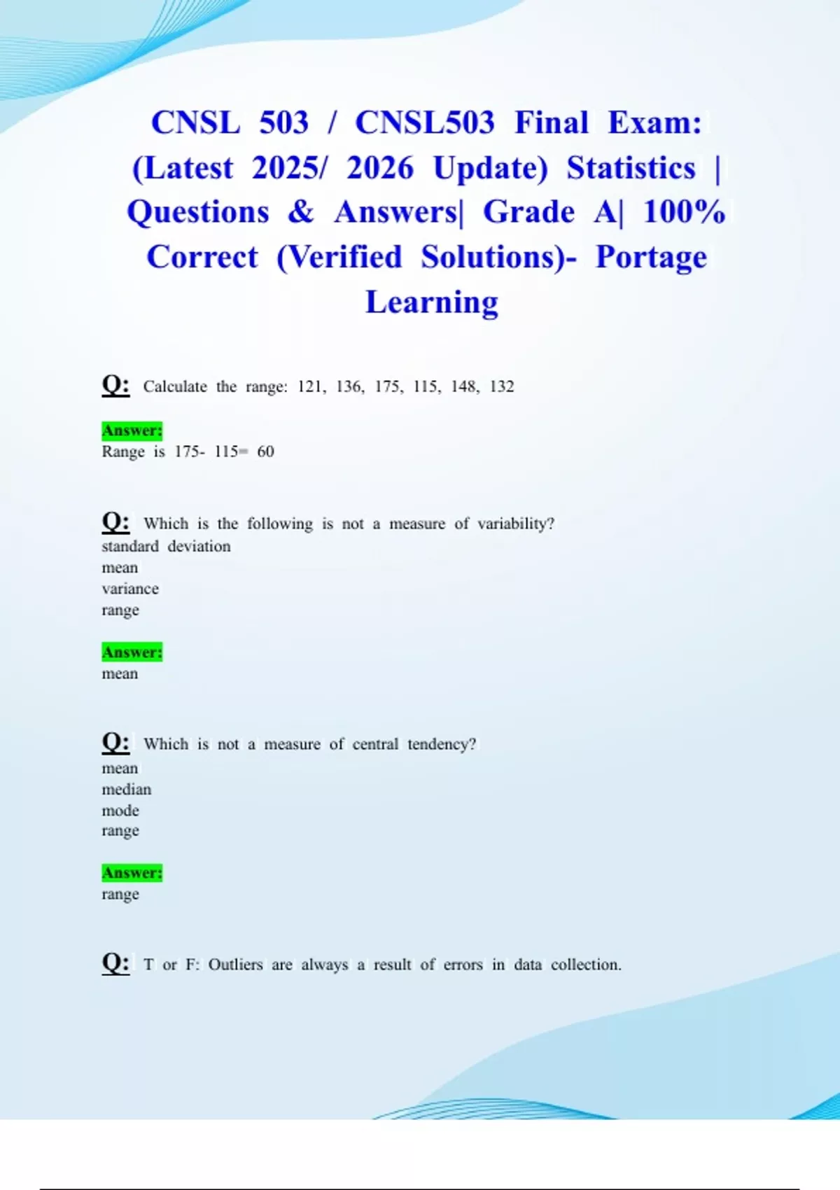 CNSL 503 / CNSL503 Modules 1/2/3/4/5/6/7/8 & Final Exam: (Latest 2025/ 2026 Updates STUDY BUNDLE PACKAGE) Statistics | Questions & Answers| Grade A| 100% Correct (Verified Solutions)- Portage Learning
