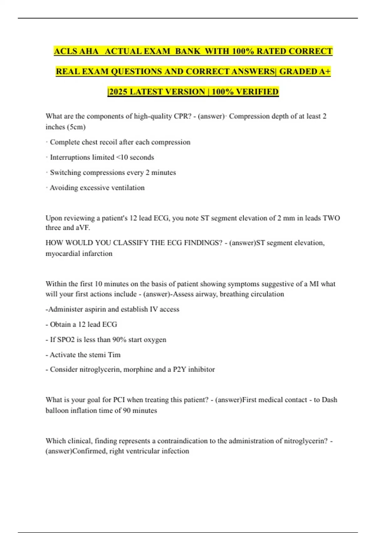 PACKAGE DEAL FOR ACLS AHA ACTUAL EXAM BANK WITH 100% RATED CORRECT REAL EXAMS QUESTIONS AND CORRECT ANSWERS| GRADED A |2025 LATEST VERSION | 100% VERIFIED| 2 VERSIONS