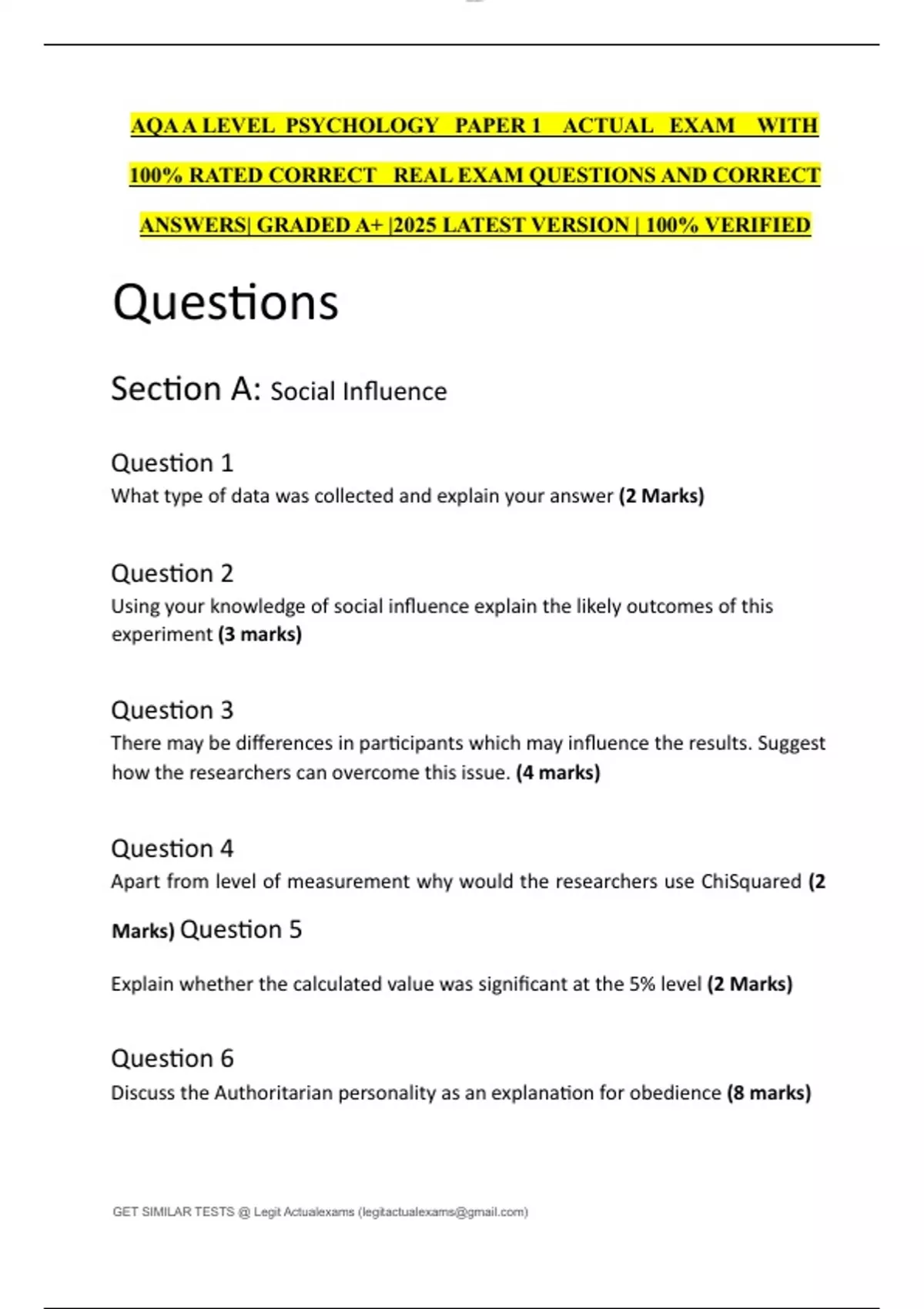 PACKAGE DEAL FOR AQA A LEVEL PSYCHOLOGY PAPER 1 & PAPER 2 ACTUAL EXAM WITH 100% RATED CORRECT REAL EXAM QUESTIONS GRADED A |2025 LATEST VERSION | 100% VERIFIED
