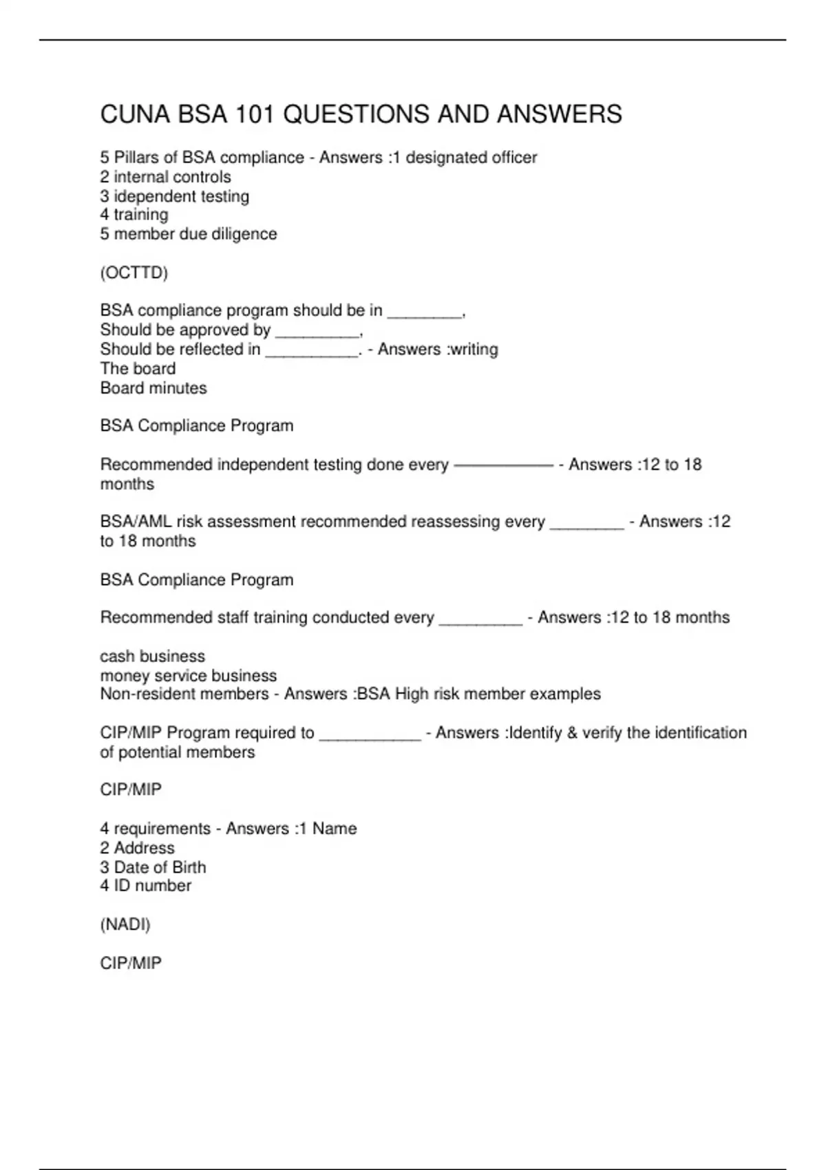 CUNA BSA 101 QUESTIONS AND ANSWERS