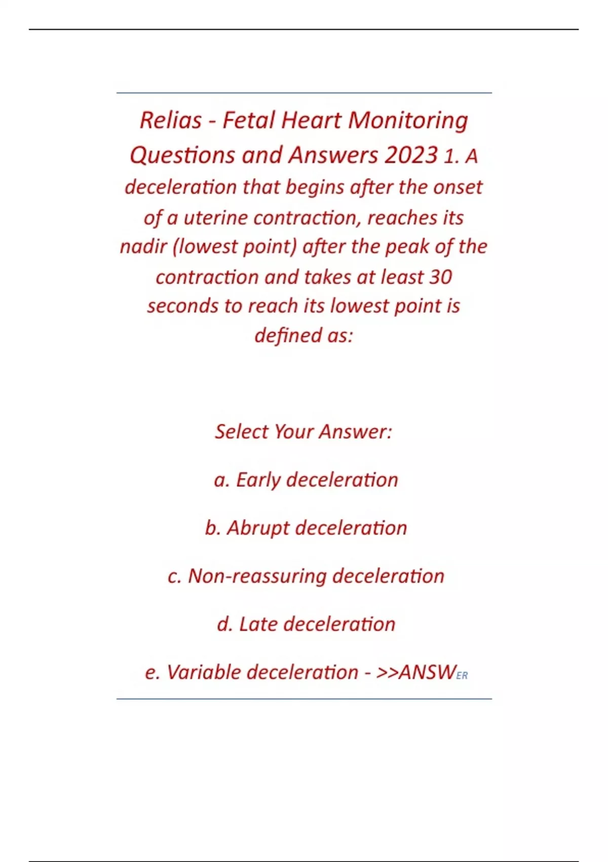 Relias - Fetal Heart Monitoring Questions and Answers 2023 1. A deceleration that begins after the onset of a uterine contraction, reaches its nadir (lowest point) after the peak of the contraction and takes at least 30 seconds to reach its lowest p