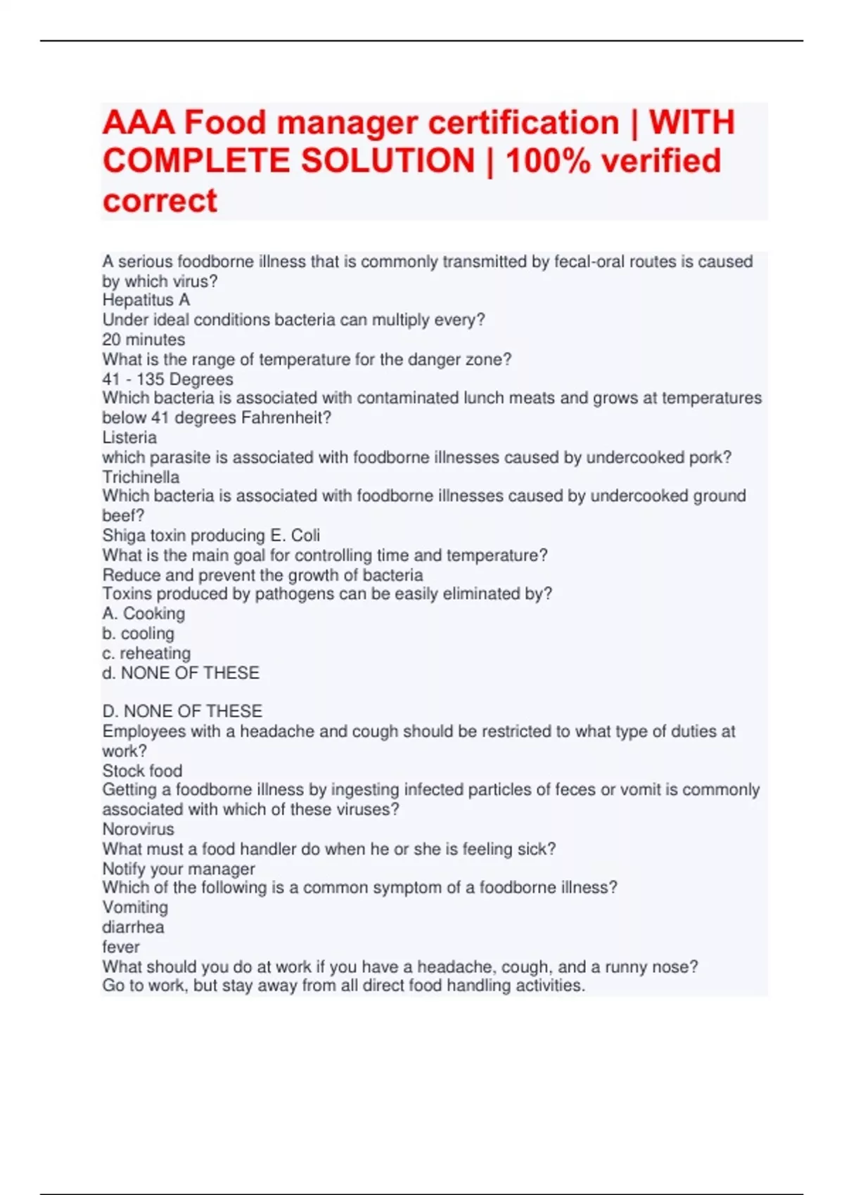 Exam (elaborations) AAA Food Manager Certification Exam 100% Verified Answers Newest 2025/2026 2 Exam (elaborations) AAA Food manager certification Final Complete Exam 2025/2026 100% VERIFIED CORRECT. 3 Exam (elaborations) AAA Food Protection Manager Practice Exam 2025/2026 100% verified correct 4 Exam (elaborations) AAA Food Protection Manager
