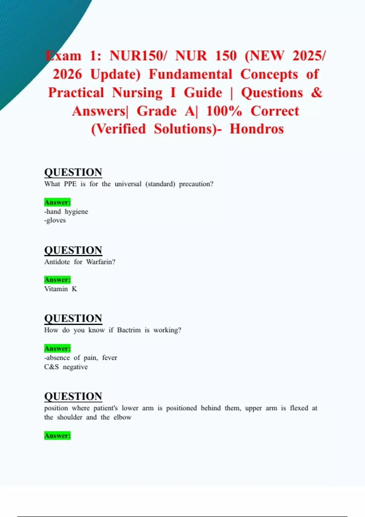 Exam 1: NUR150/ NUR 150 (NEW 2025/ 2026 Update) Fundamental Concepts of Practical Nursing I Review | Questions & Answers| Grade A| 100% Correct (Verified Solutions)- Hondros