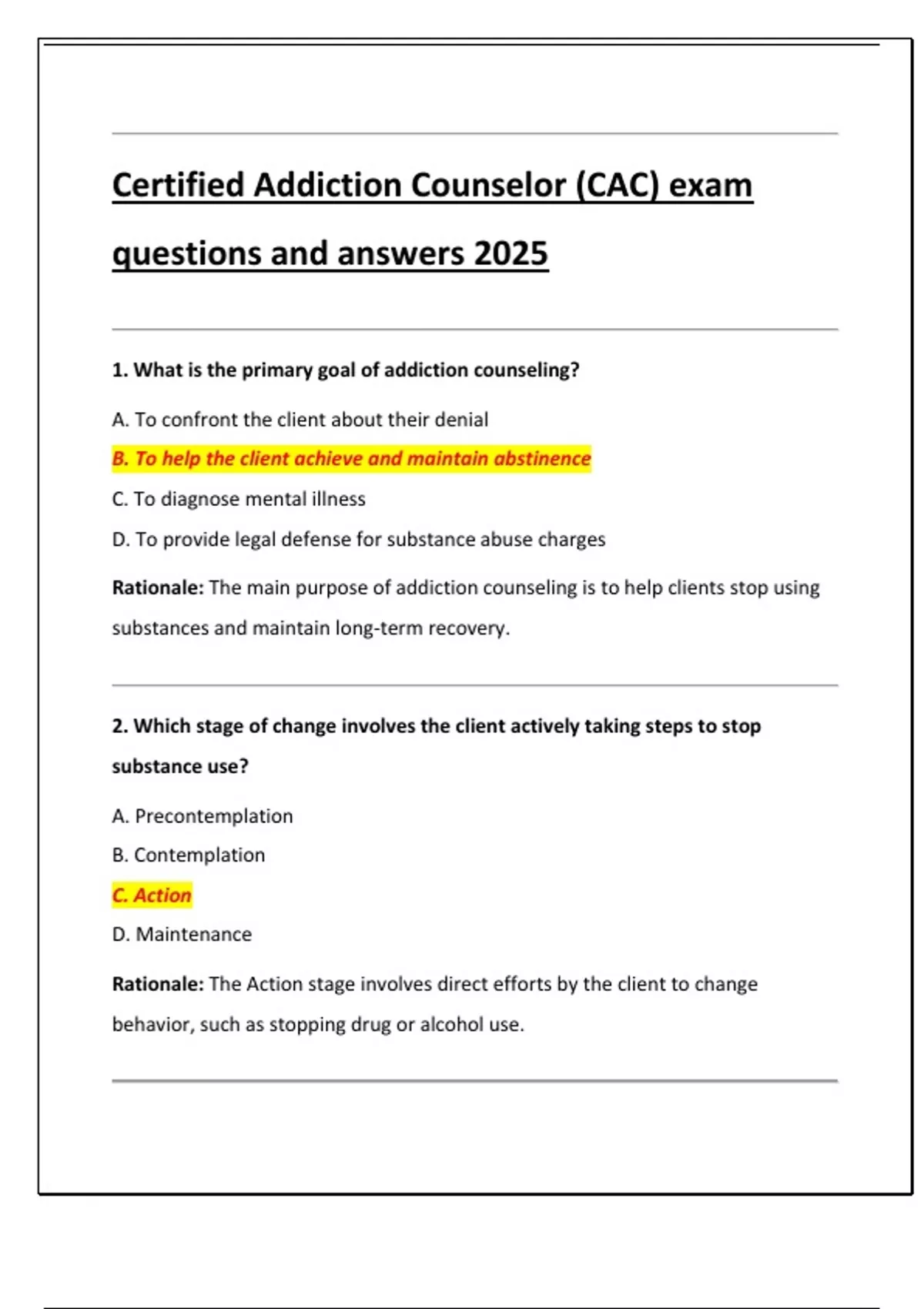 Certified Addiction Counselor (CAC) Practice Exams BUNDLE Questions and correct Answers (Verified Answers) with Rationales 2025