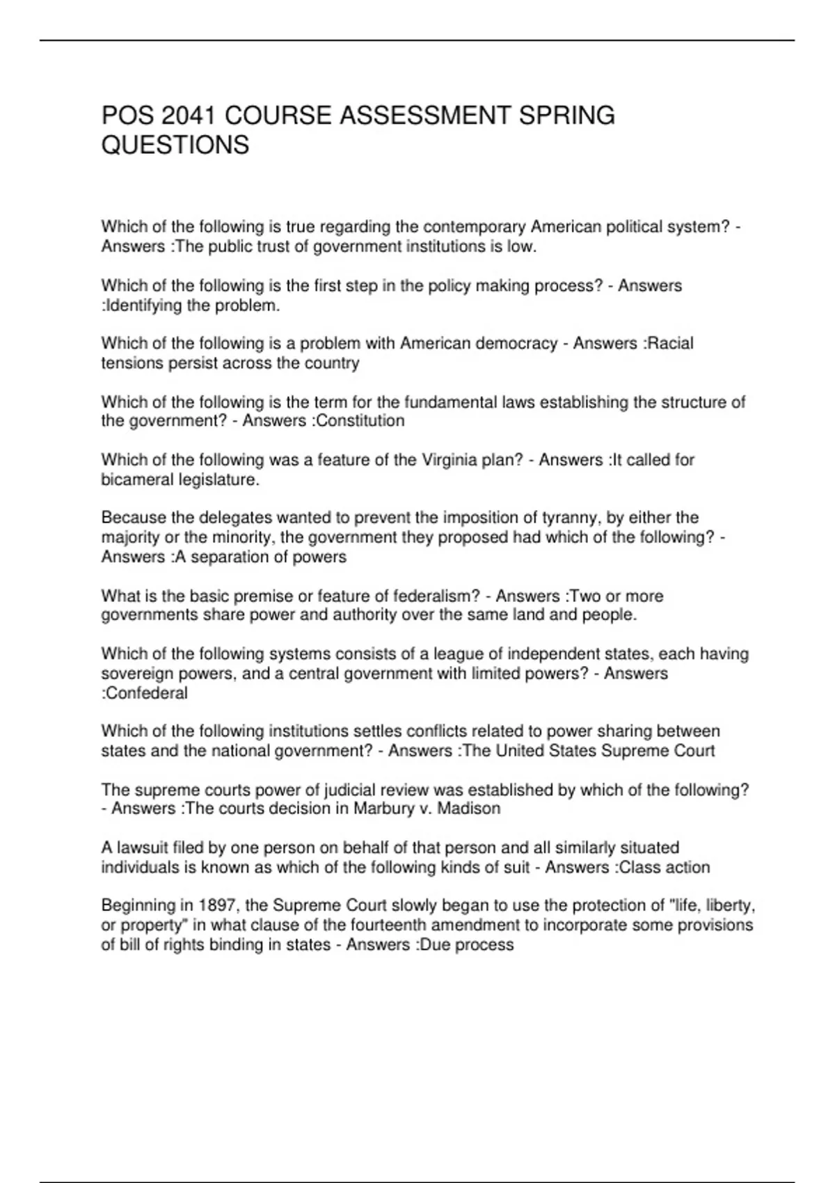 FSW: POS 2041 EXAM 4 QUESTIONS & ANSWERS 2 Exam (elaborations) POS 2041 AMERICAN NATIONAL GOVERNMENT EXAM #1 3 Exam (elaborations) POS 2041 COURSE ASSESSMENT SPRING QUESTIONS 4 Exam (elaborations) POS 2041 EXAM 1 (CHAPTER 1,2,3,5) ROBBINS UF 5 OTHER POS 2041 EXAM 1 (CHAPTERS 1-5) STUDY GUIDE 6 OTHER POS 2041 EXAM 1 CHAPTERS 1-3 7 Exam (elabor