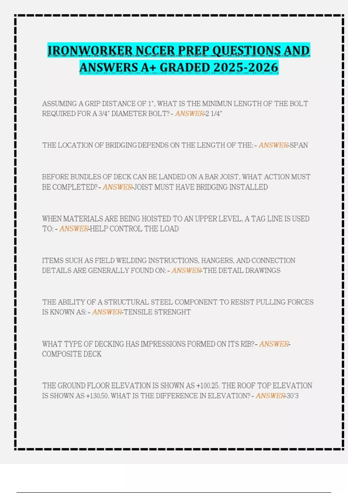 Exam (elaborations) NCCER Ironworker Level 1 - Tools & Equipment of the Trade Questions and Answers 2025 Guide 2 Exam (elaborations) IRONWORKER NCCER FINAL QUESTIONS AND ANSWERS 2025 GRADED A+ 3 Exam (elaborations) IRONWORKER NCCER PREP QUESTIONS AND ANSWERS A+ GRADED