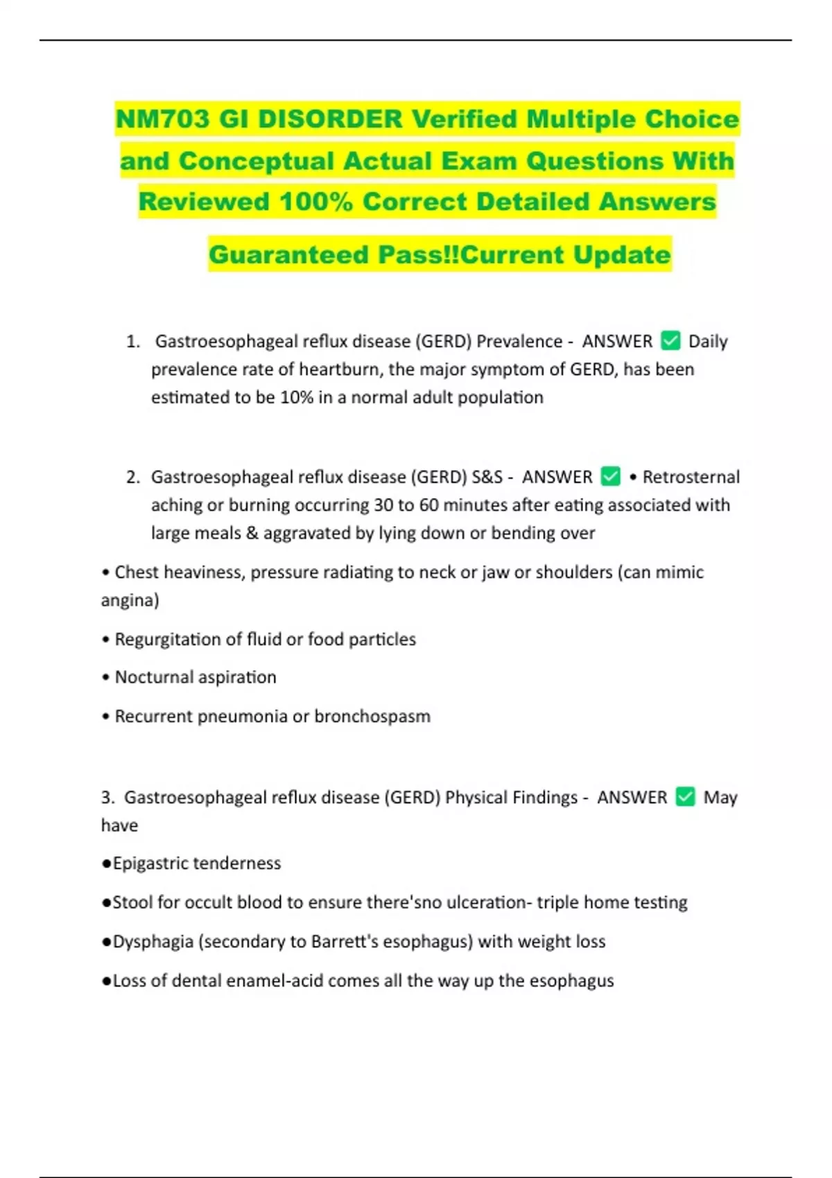 NM703 GI DISORDER {Advanced Pathophysiology – Gastrointestinal Disorders}Verified Multiple Choice and Conceptual Actual Exam Questions With Reviewed 100% Correct Detailed Answers Guaranteed Pass!!Current Update