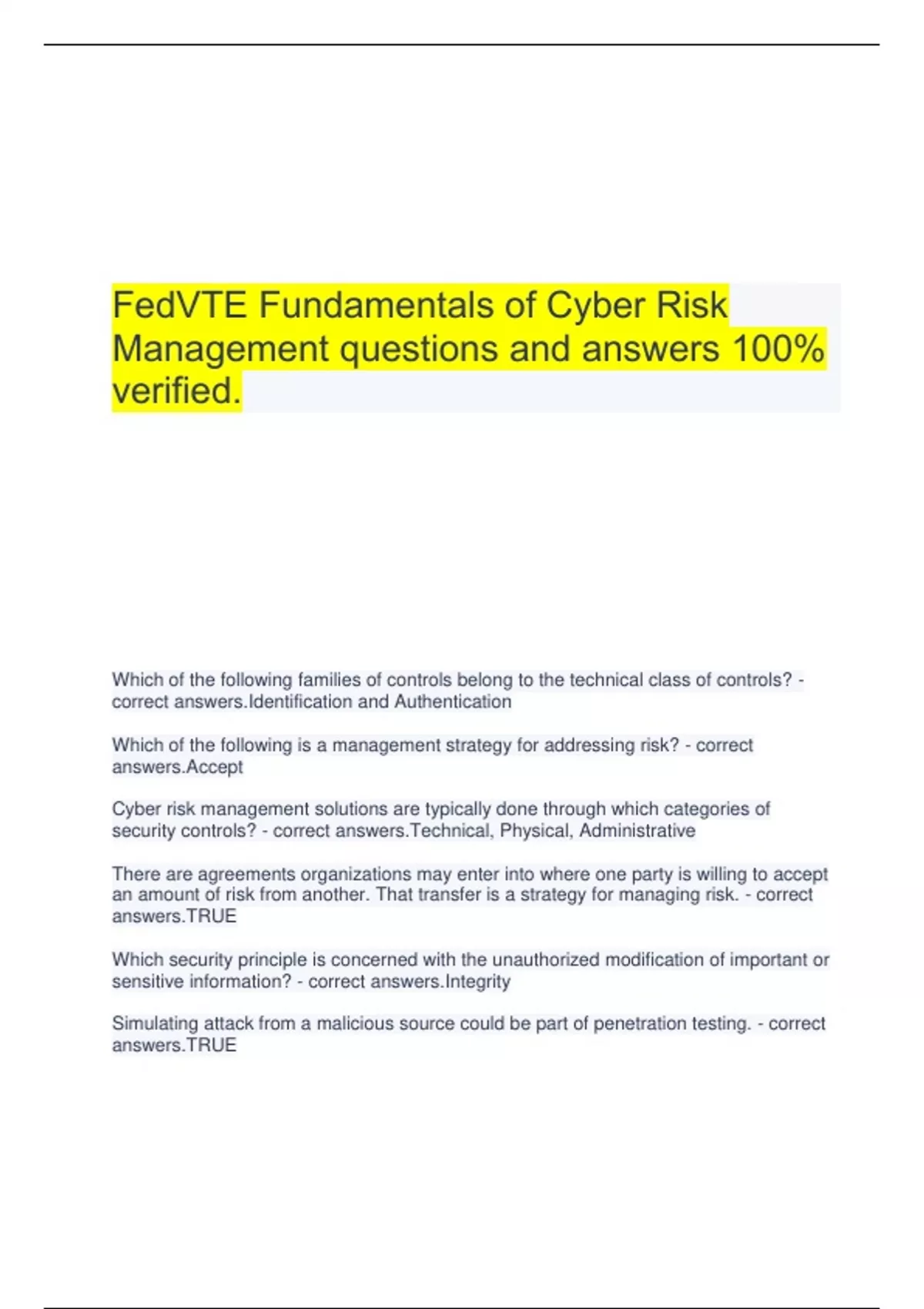 FedVTE Cyber Risk Management for Managers questions and answers 100% verified. FedVTE Cyber Risk Management for Managers questions and answers graded A+. FedVTE Cyber Risk Management for Technicians questions and answers well illustrated. CYBERSECURITY ANALYST QUIZ (FEDVTE) EXAM QUESTIONS AND ANSWERS GRADED A+ LATEST UPDATE.