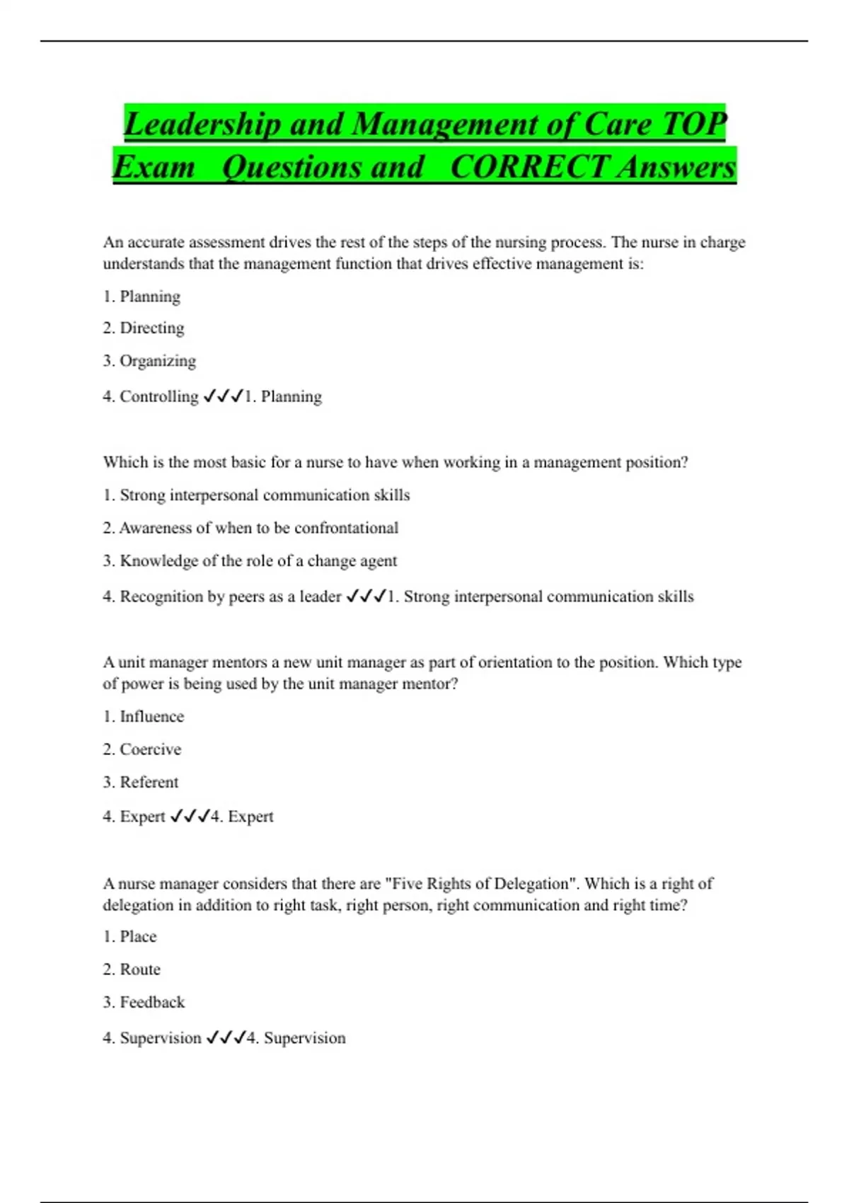 Leadership and Management of Care TOP Exam Questions and CORRECT Answers