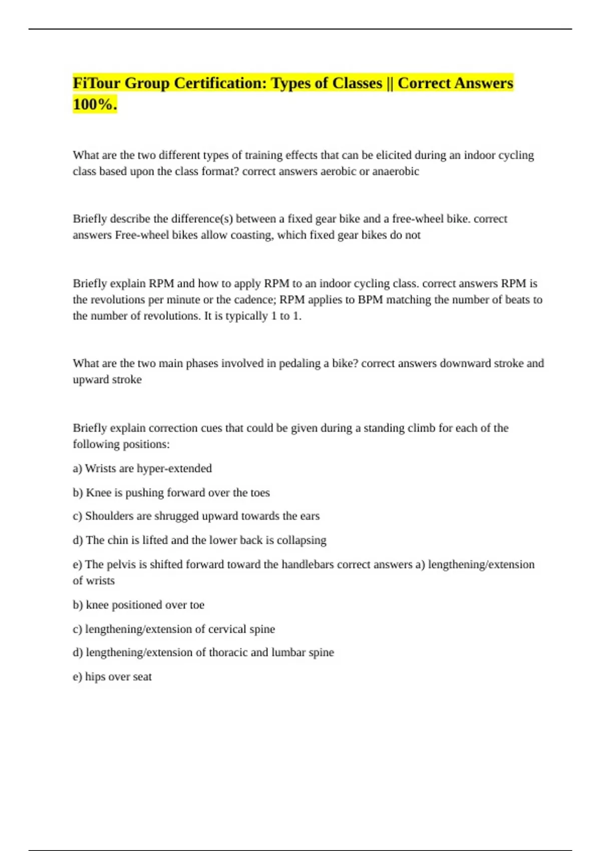Fitour Primary personal training certification course || 100% Verified Answers. FiTour Group Certification: Types of Classes || Correct Answers 100%. FITOUR Group Exercise Certification || All Solved. FiTOUR Primary Aqua Instructor Certification || with 100% Correct Answers. Fitour Primary Personal Training || Graded A+.
