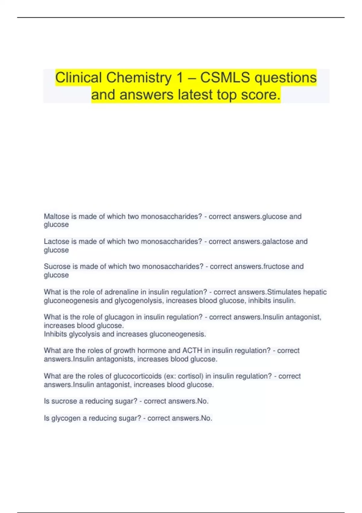 CLINICAL CHEMISTRY PRACTICE EXAM QUESTIONS AND ANSWERS GRADED A+ LATEST UPDATE. CLINICAL CHEMISTRY EXAM 1 GRADED A+ 100% VERIFIED. BOC STUDY GUIDE CLINICAL CHEMISTRY EXAM QUESTIONS AND ANSWERS GRADED A+ LATEST UPDATE. Clinical Chemistry 1 – CSMLS questions and answers latest top score.