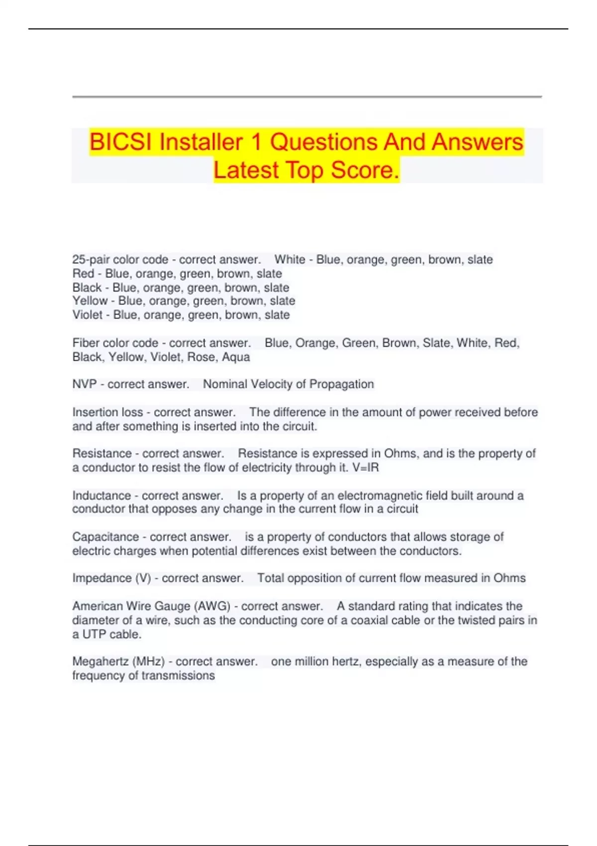 BICSI INSTALLER 2 COPPER STUDY EXAM GRADED A+ LATEST UPDATE. BICSI INSTALLER 2 FIBER MODULE EXAM GRADED A+ NEWEST VERSION. BICSI Installer 1 Questions And Answers Latest Top Score. BICSI INSTALLER 1 EXAM GRADED A+ LATEST UPDATE. BICSI INSTALLER 1 EXAM REVIEW QUESTIONS AND ANSWERS GRADED A+ LATEST UPDATE.