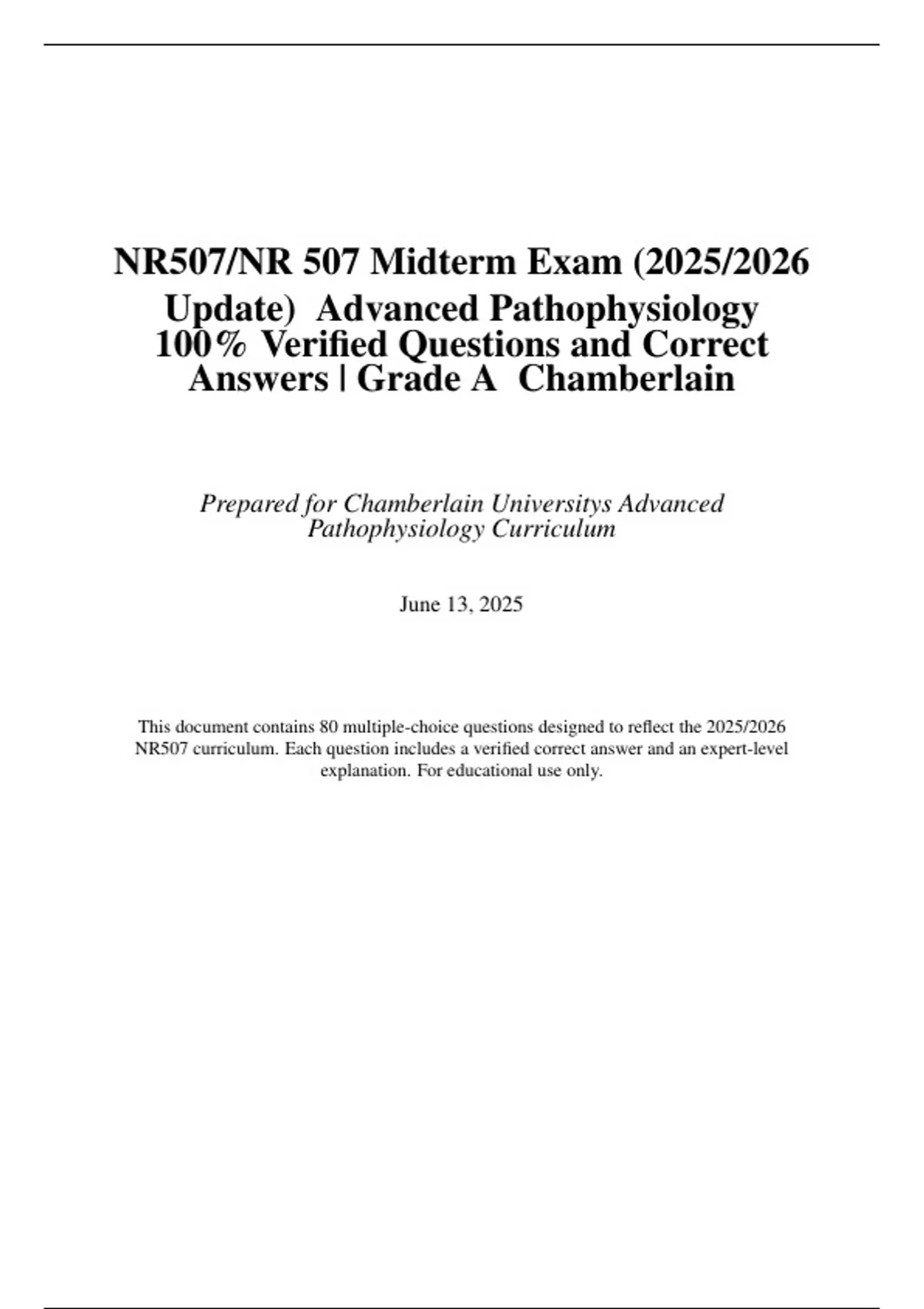 NR507 / NR 507 Midterm & Final Exam 2024/2025 Study Bundle – Advanced Pathophysiology Reviews with 100% Correct Verified Questions & Grade A Answers | Chamberlain