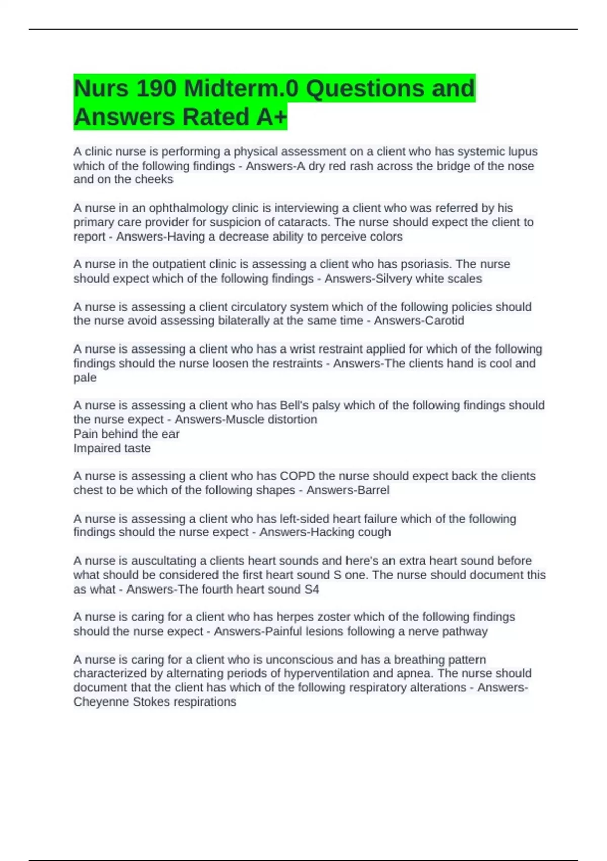 nurs 190 3.0 exam solved 100% correct 2 Exam (elaborations) nurs 190 6.0 exam graded A+ (verified) 3 Exam (elaborations) Nurs 190 Midterm.0 Questions and Answers Rated A+ 4 Exam (elaborations) NURS 190 Physical Assessment (Week 1) with Complete Solutions Rated A+ 5 Exam (elaborations) NURS 190 Physical Assessment Cardiovascular Questions and An