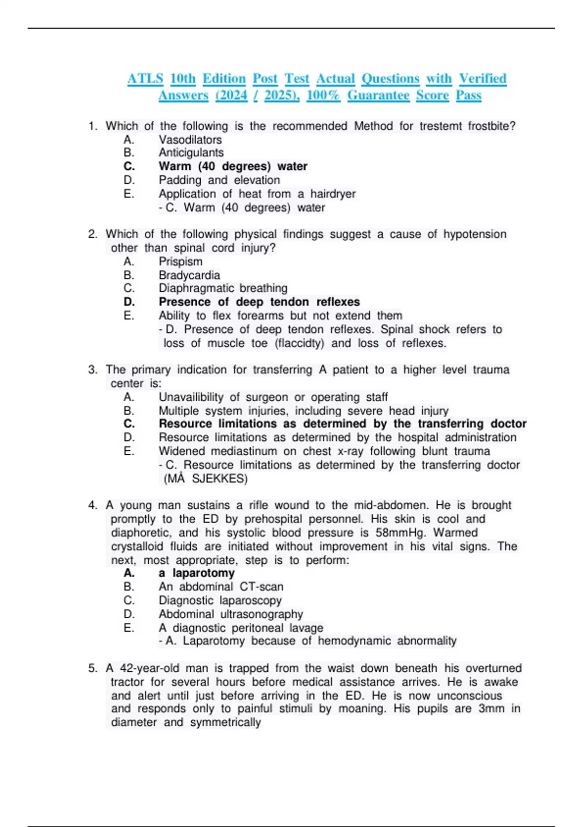 ATLS 10th Edition Post Test Actual Questions with Verified Answers (2025 / 2026), 100% Guaranteed Score Pass ||Compilation Bundle