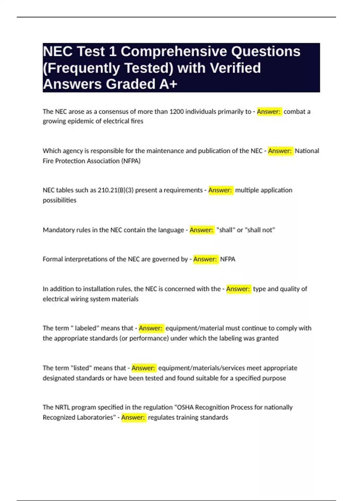 Nec Practice Comprehensive Questions (Frequently Tested) with Verified Answers Graded A Package Deal
