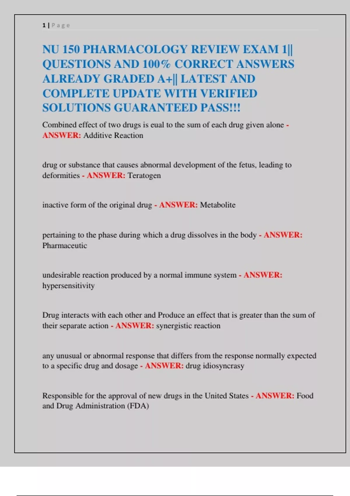 NU 150 PHARMACOLOGY REVIEW EXAM 1|| NU150 PHARMACOLOGY EXAM 2 || NU150 PHARMACOLOGY EXAM 3|| QUESTIONS AND 100% CORRECT ANSWERS ALREADY GRADED A+|| LATEST AND COMPLETE UPDATE WITH VERIFIED SOLUTIONS GUARANTEED PASS!!!