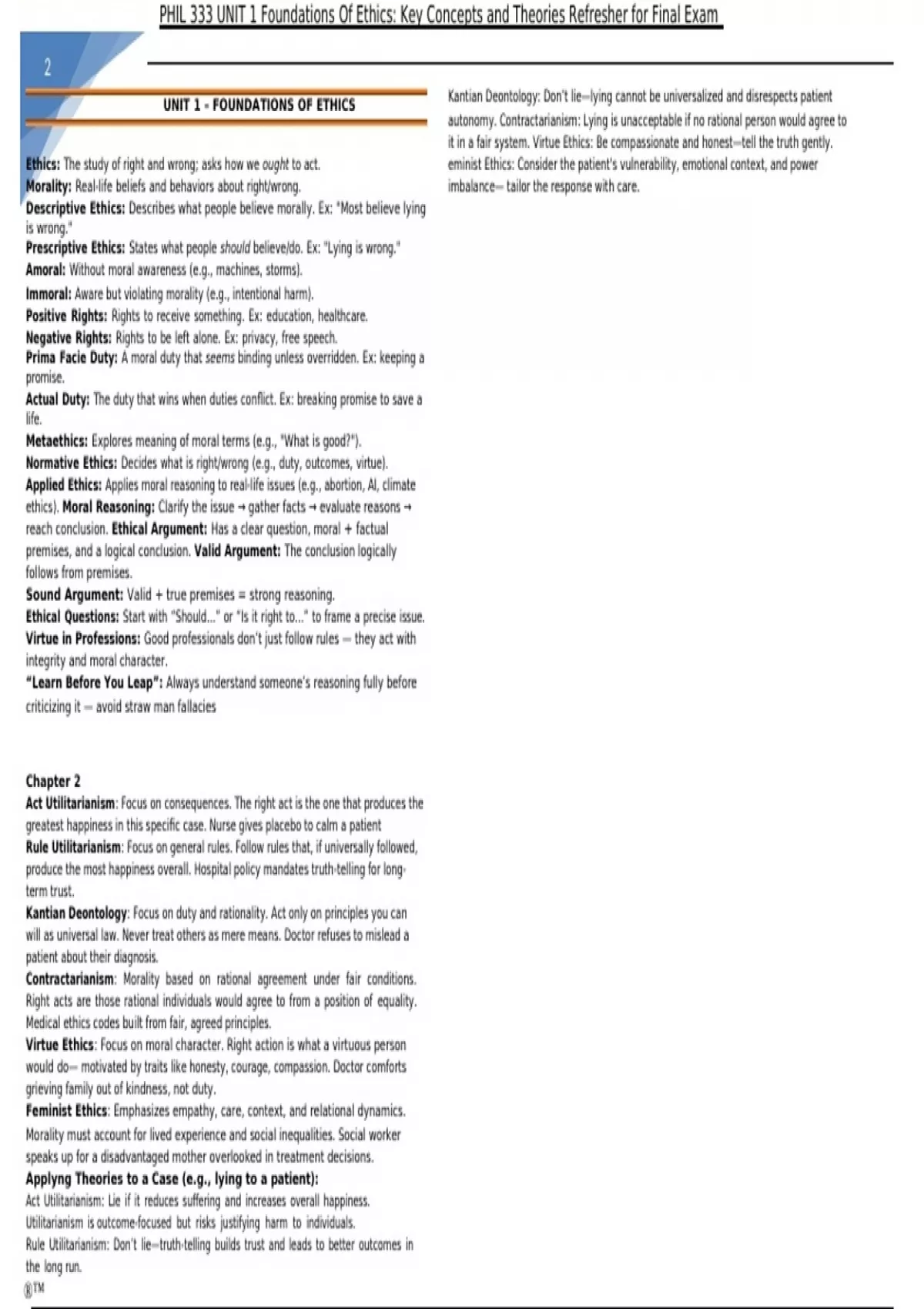 PHIL 333 Condensed Exam Prep: Ethics & Morality Review Units 1-4.