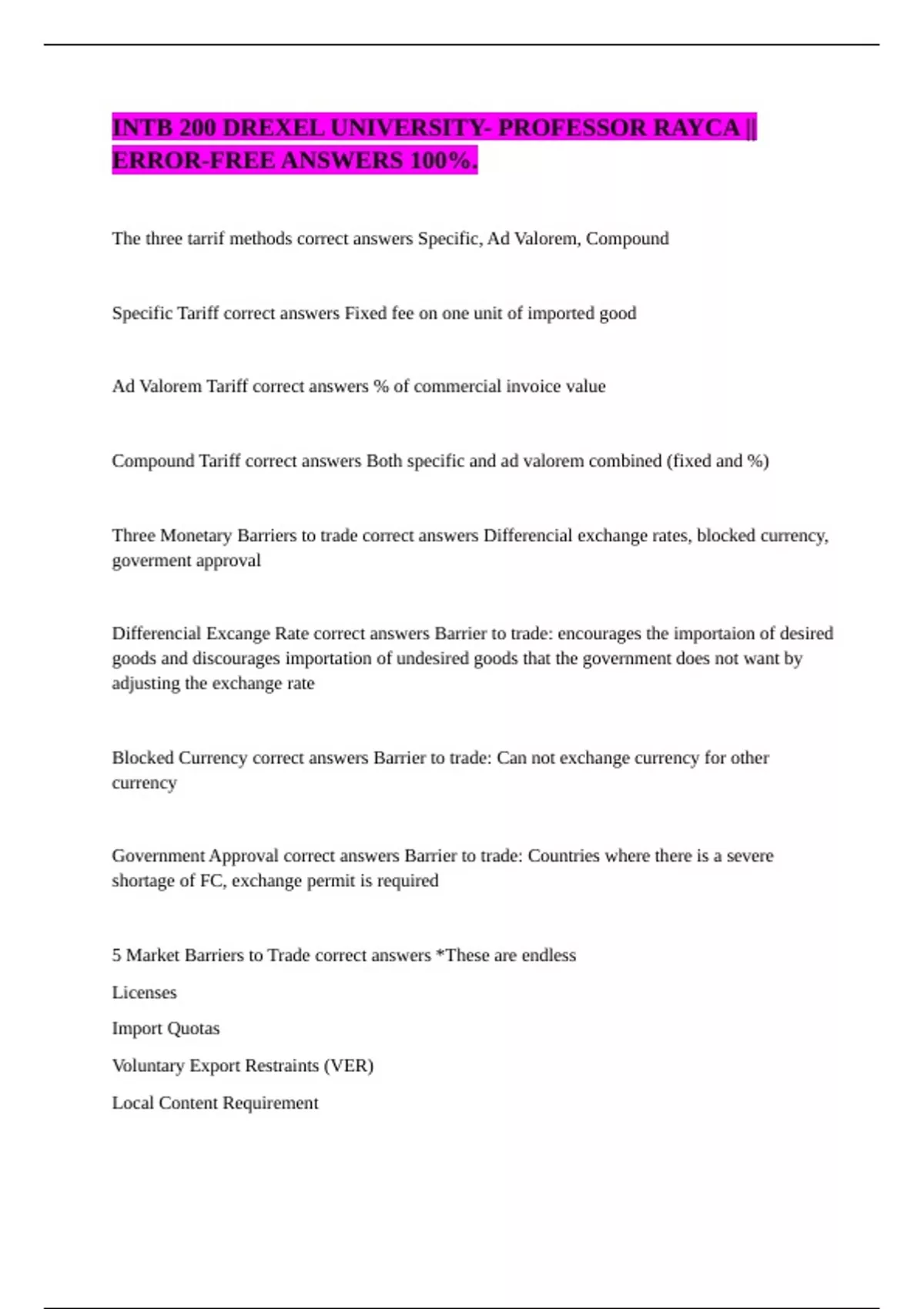 INTB 200 MIDTERM || with Error-free Answers. INTB 200: Final Study Guide || All Solutions are Accurate. INTB 200 Midterm Review || with Errorless Answers. INTB 200 DREXEL UNIVERSITY- PROFESSOR RAYCA || ERROR-FREE ANSWERS 100%. INTB 200 Final || Acknowledged Answers 100%. INTB 200 Final || All Solved. INTB 200 Final || with Certified Answers.