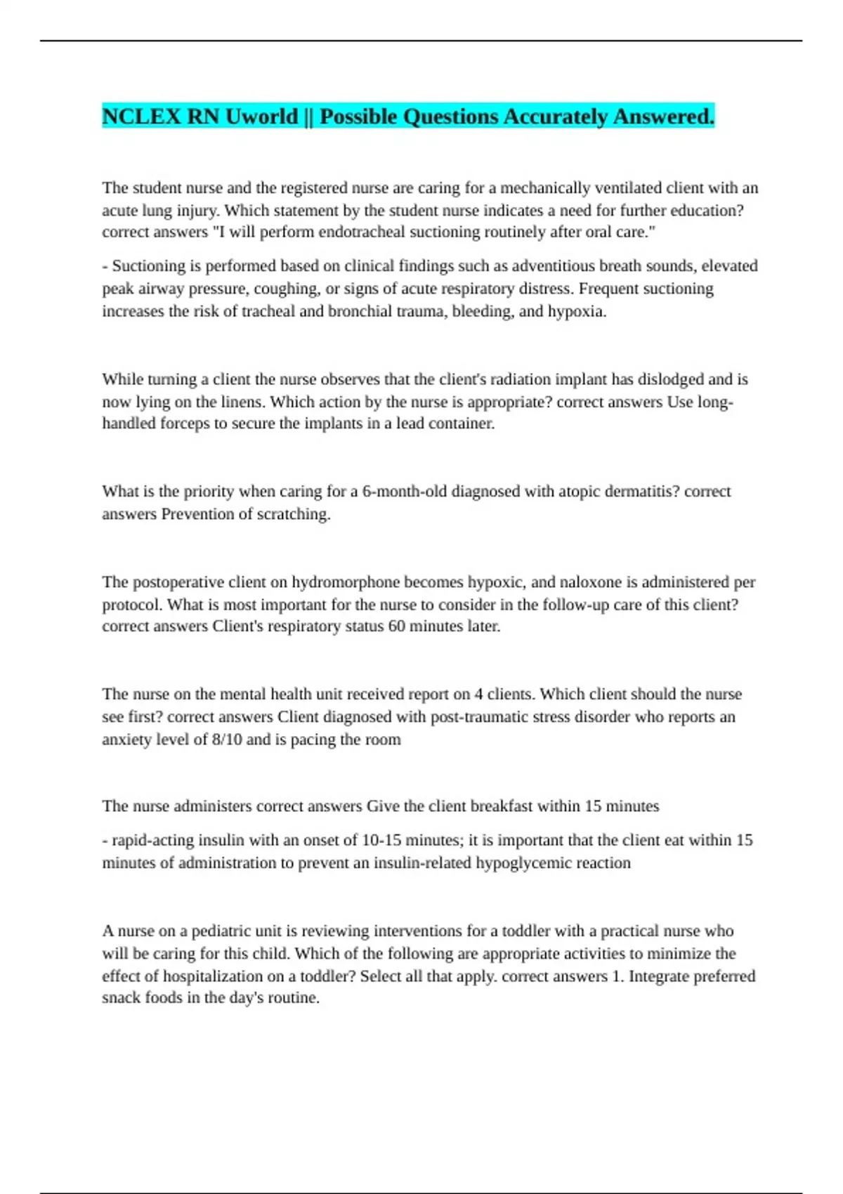 NCLEX RN uworld #17 || with Certified Answers. UWorld NCLEX-RN: Adult Health: Cardiovascular || with Complete Solution. UWorld NCLEX-RN Pharmacology || 100% Correct Answers. UWorld NCLEX-RN Maternal and Newborn Health || All Accurately Answered. UWorld NCLEX-RN Leadership & Management || 100% Accurate Answers. UWorld NCLEX-RN Child Health || with 1