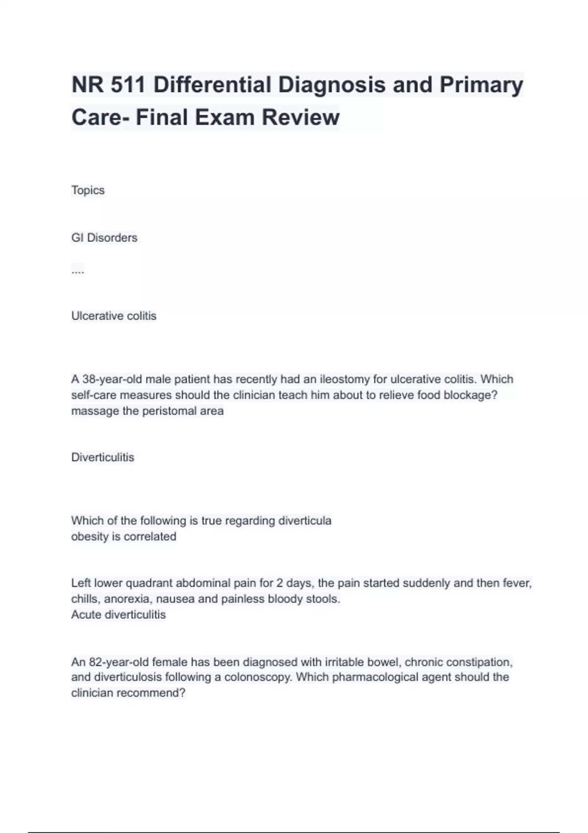 Final Exam for NR511 / NR 511 Differential Diagnosis and Primary Care | Complete Study Guide with Key Definitions and Strategies